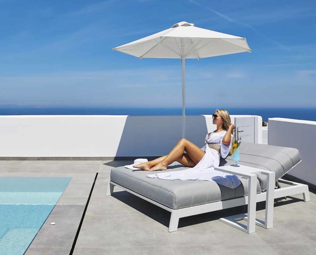 Διπλή ξαπλώστρα αλουμινίου με επένδυση από αφρό γρήγορου στεγνώματος και ύφασμα Sunbrella®. Διατίθεται για εξωτερική χρήση.
