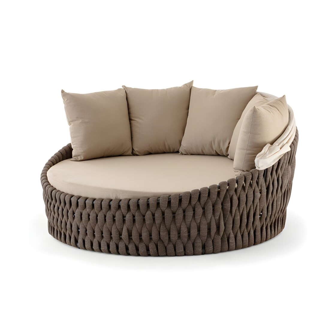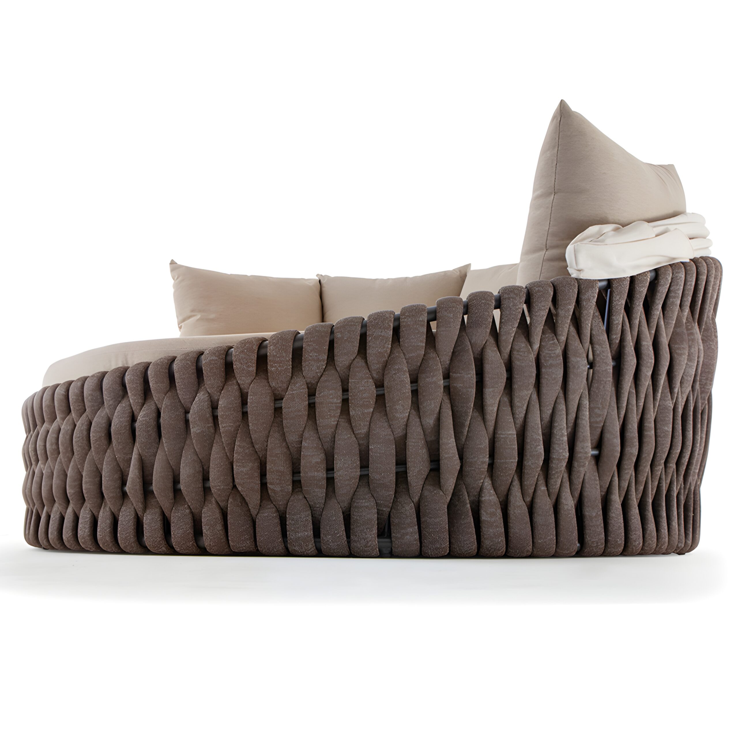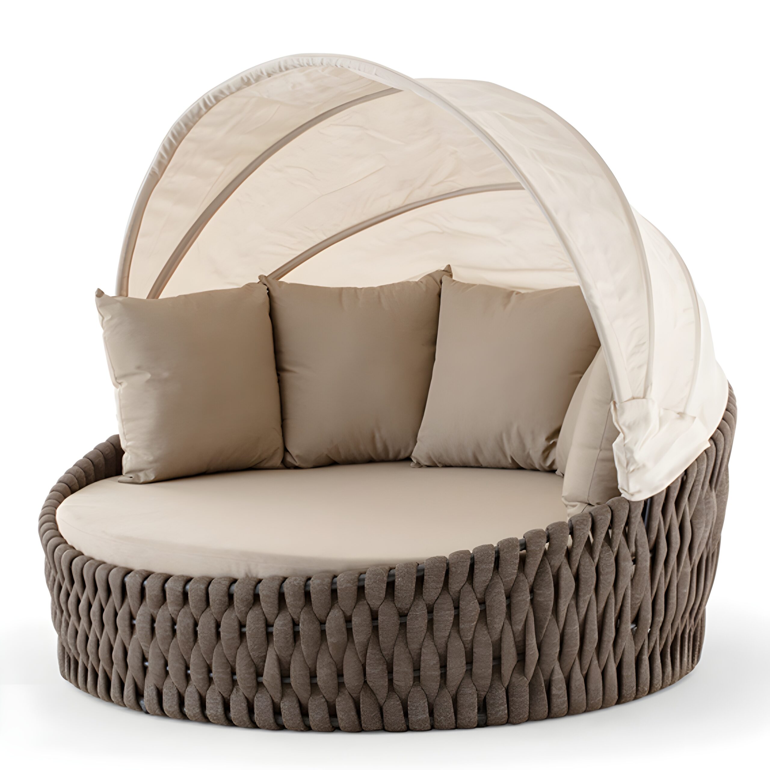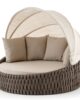 Aluminium sunbed covered with textylene and rubber rope. Mattress upholstered with waterproof fabric, adjustable tent with acrylic fabric.