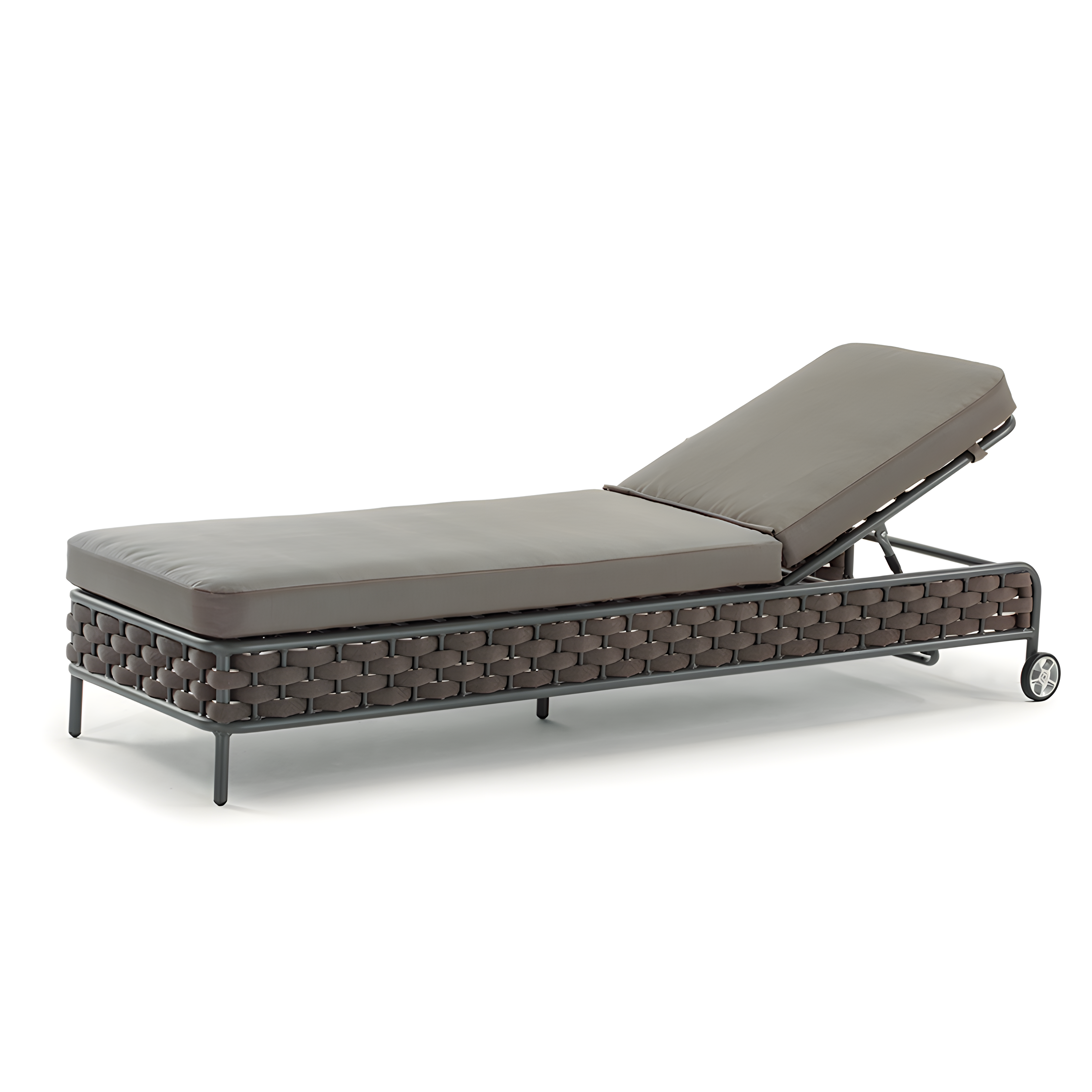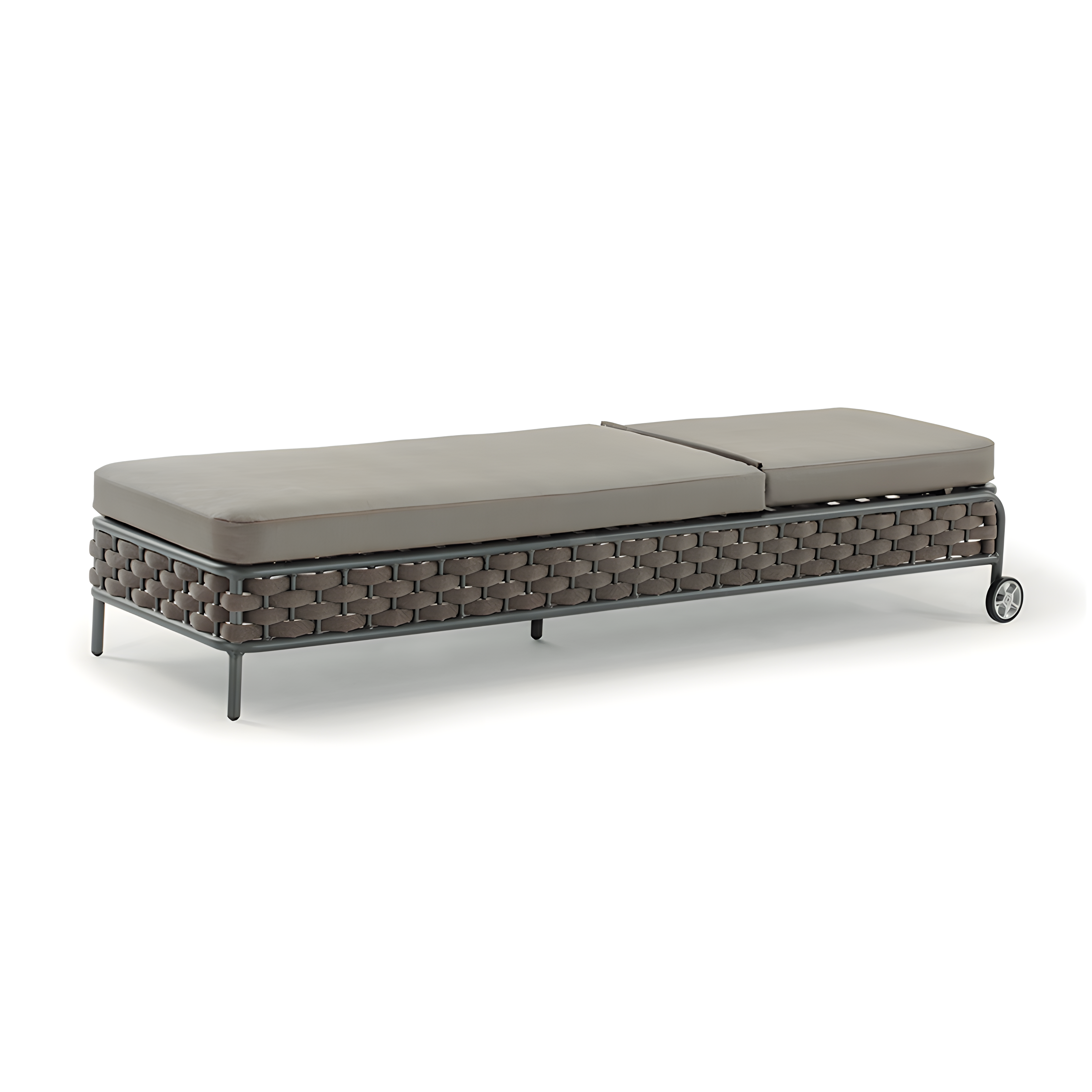 Aluminium sunbed covered with textylene and rubber rope. Textylene cushions.