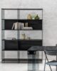 BYBLOS is an elegant and prestigious modular bookcase, made with 10 mm transparent or smoked tempered glass load-bearing sides and 25 mm laminate shelves. The shelves are available in various sizes: 43, 58, 88 cm. A 158 cm module is also available. The bookcase is very versatile and can be used in linear compositions or in the centre of the room as a divider. The composition in the photo is made up of: 0/70A-F2 (2 sets) pair of tempered glass load-bearing sides, 1x36x202h cm, complete with aluminium assembly accessories. 0/70A-R88 set of 88 cm laminate shelves, 88x36x2.5h cm. Laminate bottom. 0/70A3-R58 set of 58 cm laminate shelves (with 3 bottoms) 58x36x2.5h cm – Laminate bottom. 0/70A-R43 set of 43 cm laminate shelves, cm 43x36x2.5h. Laminate bottom.