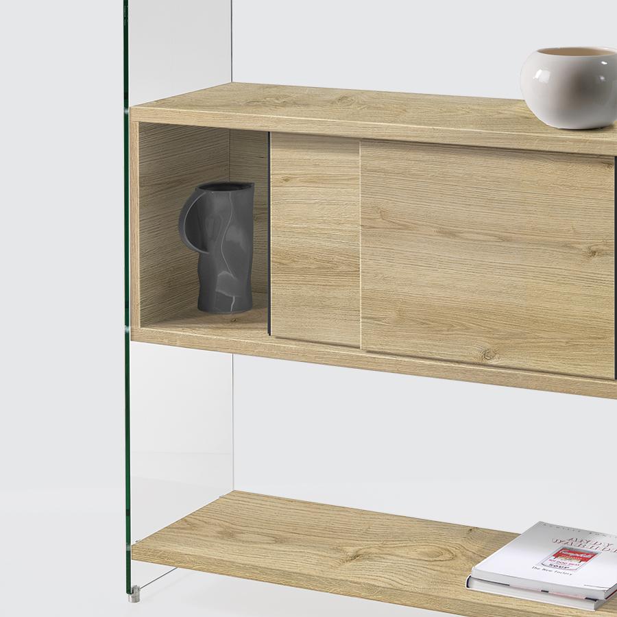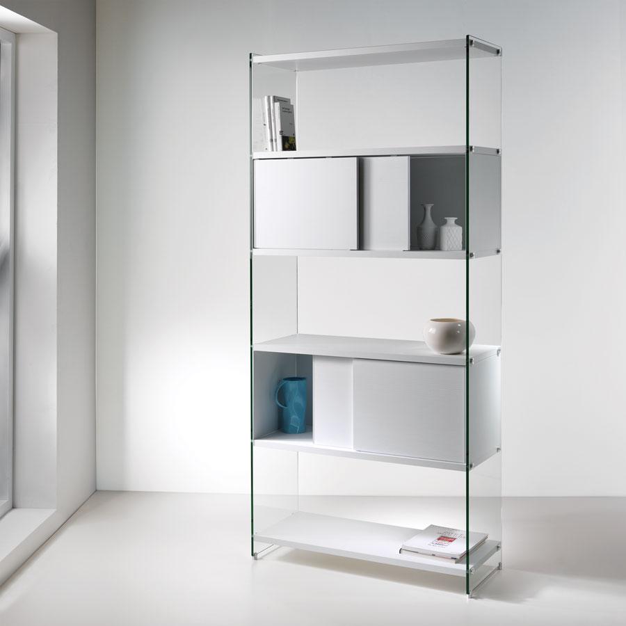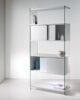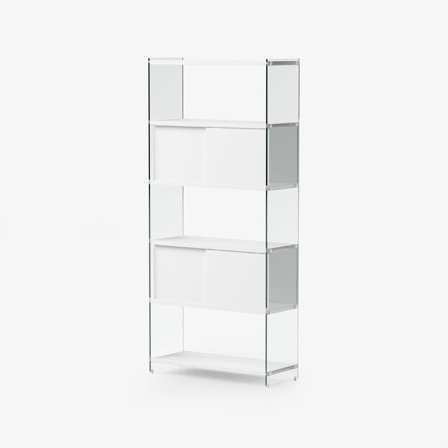 BYBLOS is an elegant and prestigious modular bookcase, made with 10 mm transparent or smoked tempered glass load-bearing sides and 25 mm laminate shelves. The shelves are available in various sizes: 43, 58, 88 cm. A 158 cm module is also available. The bookcase is very versatile and can be used in linear compositions or in the centre of the room as a divider. The composition in the photo is made up of: 0/70A-F2 (2 sets) pair of tempered glass load-bearing sides, 1x36x202h cm, complete with aluminium assembly accessories. 0/70A-R88 set of 88 cm laminate shelves, 88x36x2.5h cm. Laminate bottom. 0/70A3-R58 set of 58 cm laminate shelves (with 3 bottoms) 58x36x2.5h cm – Laminate bottom. 0/70A-R43 set of 43 cm laminate shelves, cm 43x36x2.5h. Laminate bottom.