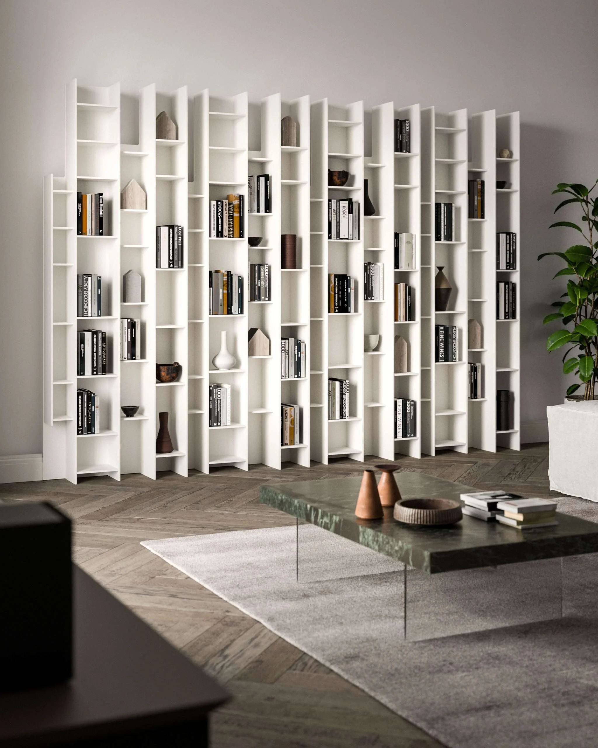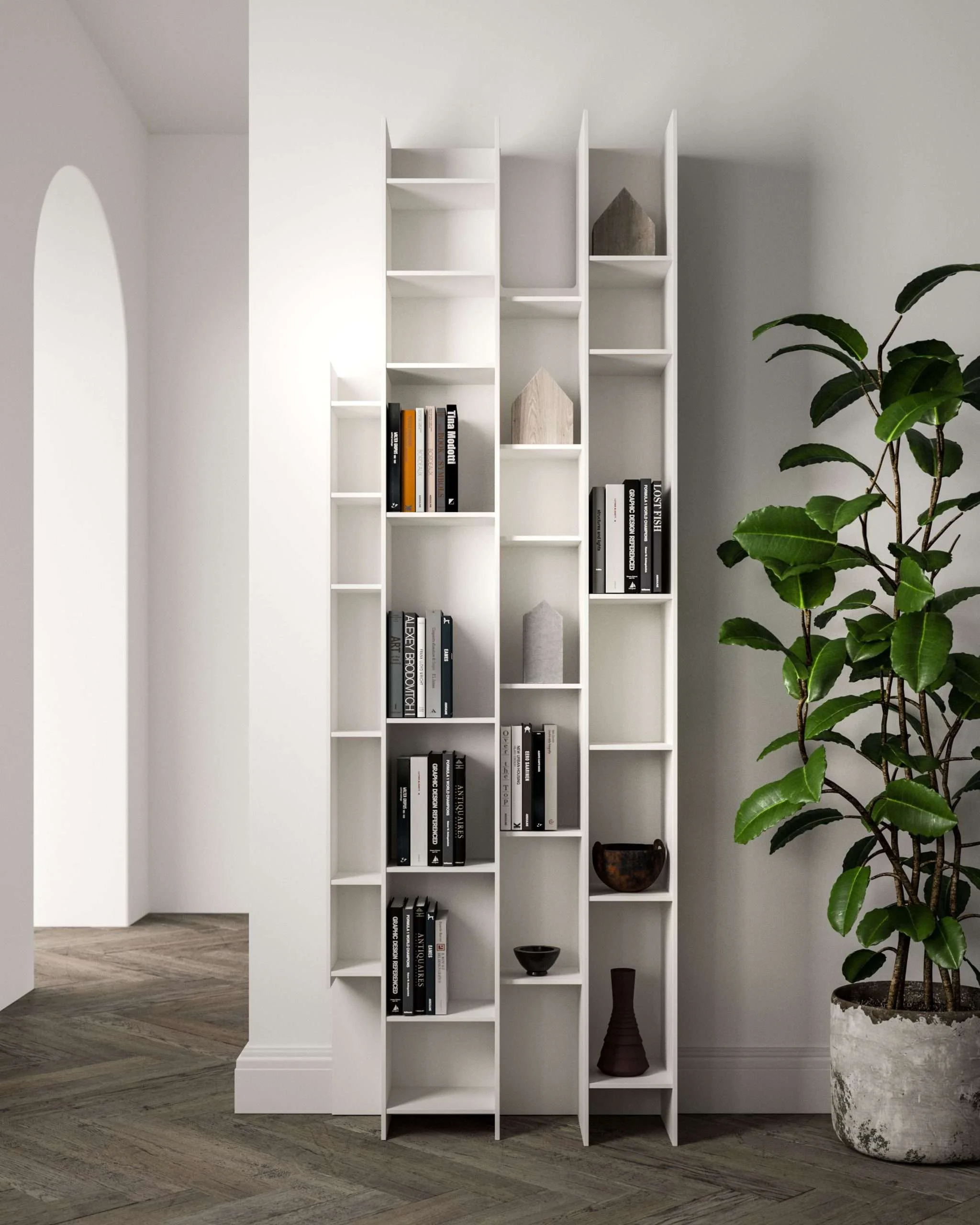 Μια βιβλιοθήκη με ακανόνιστα σχήματα, με ορθοστάτες και ράφια που μπλέκονται και αναστρέφονται σε ένα παιχνίδι γεωμετριών. Προσανατολισμένο κάθετα και οριζόντια, στο έδαφος ή κρεμασμένο, το Byblos είναι ένα είδος λαβύρινθου, ένα δημιούργημα που αιωρείται μεταξύ τάξης και χάους, του οποίου η ομορφιά είναι μοναδική.