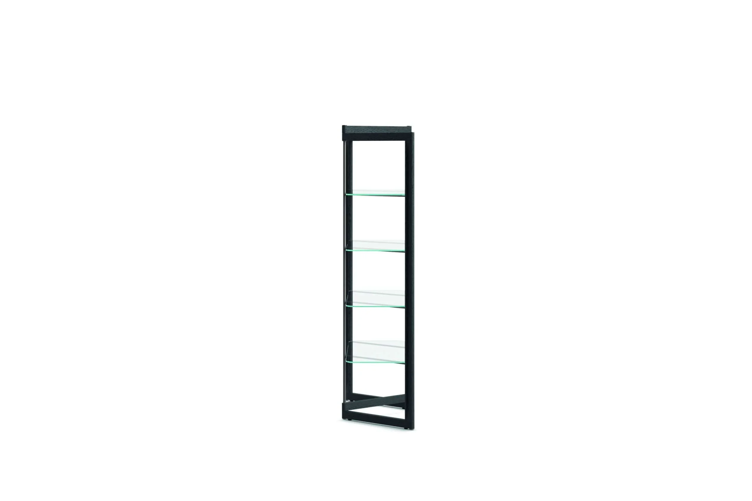(γ-δ) Αυτοφερόμενη σπονδυλωτή βιβλιοθήκη με ξύλινη κατασκευή, μεταλλικούς ορθοστάτες και γυάλινα ράφια. Ιδανικό για τοποθέτηση στον τοίχο ή ως διαχωριστικό στοιχείο στη μέση του δωματίου.