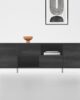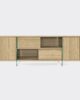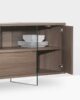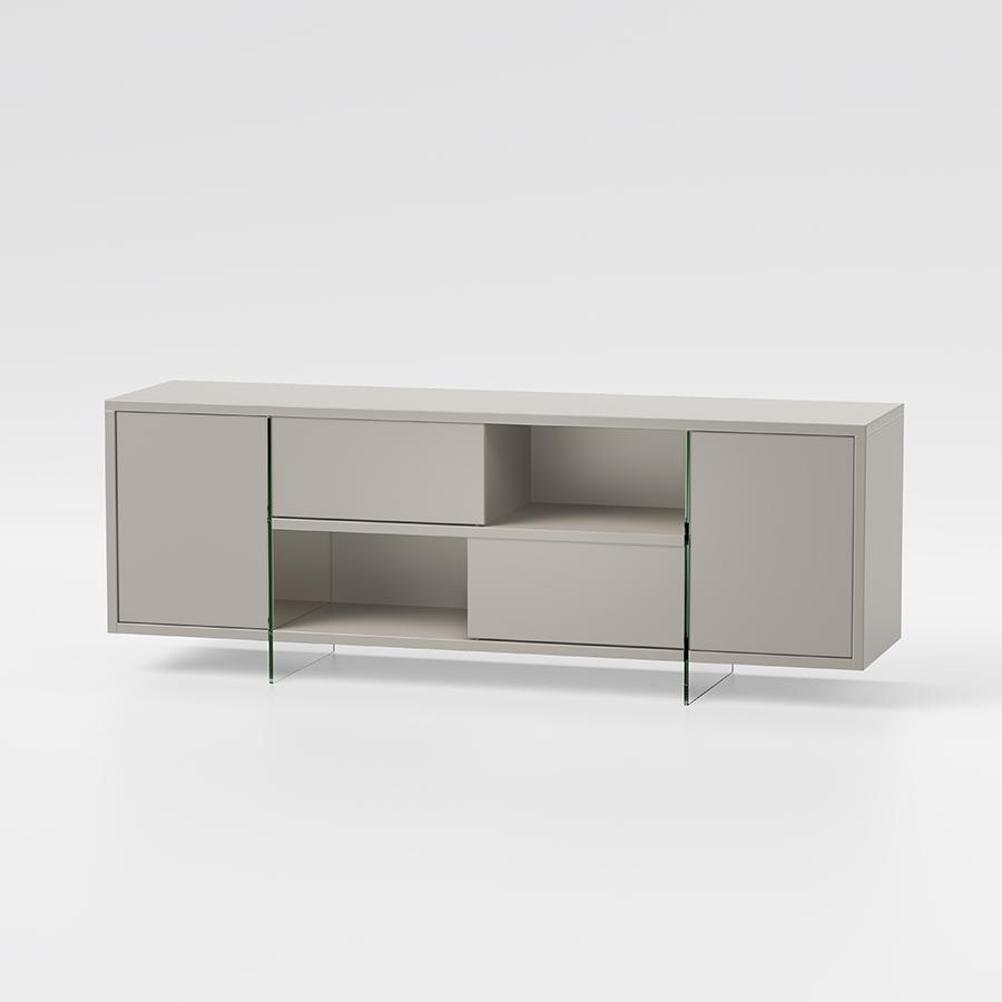 Sideboard with structure made of 25 mm thick Ecological laminate, 18 mm doors and sliding doors. Inside, two 10 mm tempered glass panels support the structure and divide the spaces with light transparency. Height-adjustable aluminum feet.