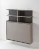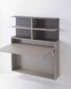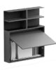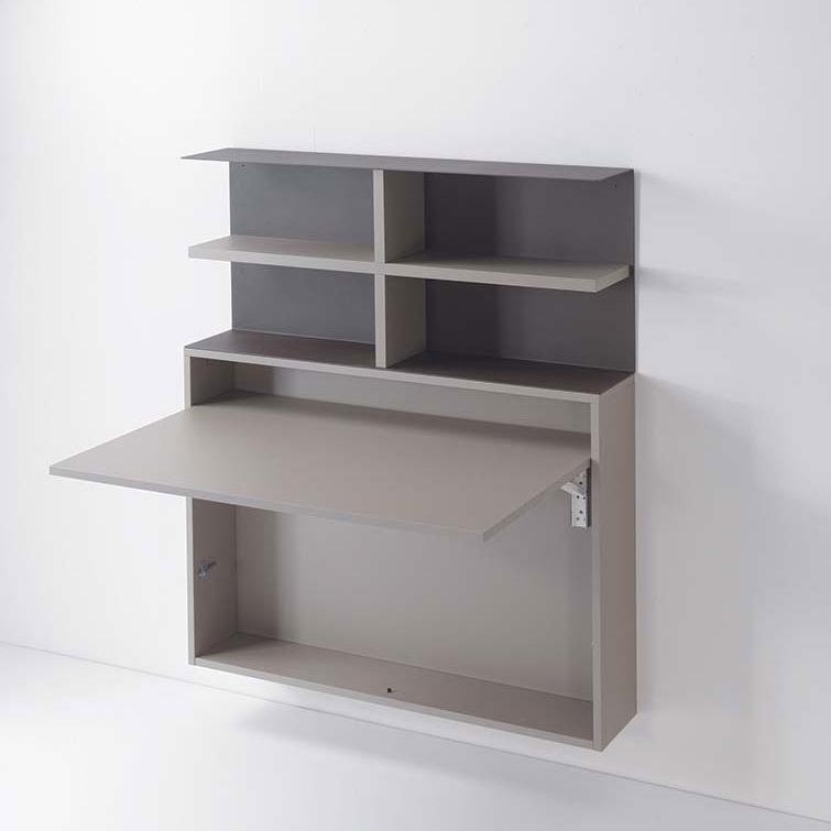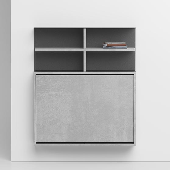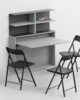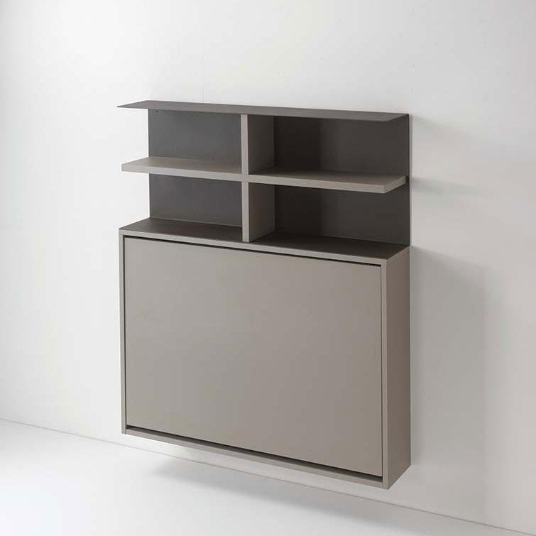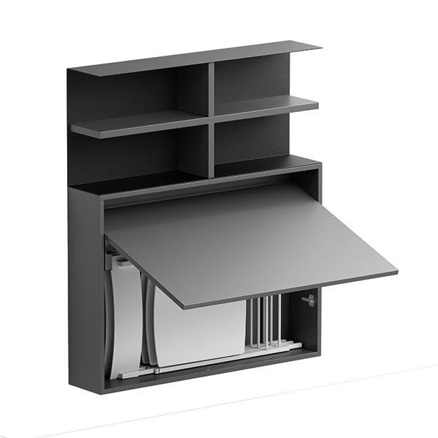 System composed of: Folding wall-mounted table/desk, made of 18 mm Ecological laminate. The internal compartment can contain up to 3 Zeta or First folding chairs. Wall-mounted bookcase with structure in painted steel with a sablé finish and 25 mm Ecological laminate shelf. The composition in the photo is composed of: 0/87 wall-mounted table/desk (1 piece) 0/67 wall-mounted bookcase (1 piece) SE03 Zeta folding chair (3 pieces)