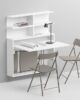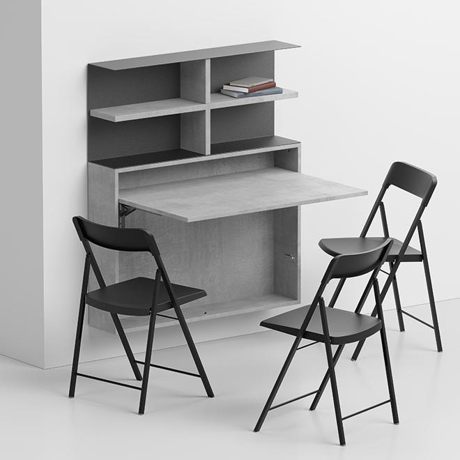 Σύστημα που αποτελείται από: Πτυσσόμενο επιτοίχιο τραπέζι/γραφείο, κατασκευασμένο από οικολογικό laminate 18 mm. Η εσωτερική θήκη μπορεί να περιέχει έως και 3 πτυσσόμενες καρέκλες Zeta ή First. Επιτοίχια βιβλιοθήκη με δομή από βαμμένο ατσάλι με φινίρισμα σαμπλε και ράφι Ecological laminate 25 mm. Η σύνθεση της φωτογραφίας αποτελείται από: 0/87 επιτοίχιο τραπέζι/γραφείο (1 τεμάχιο) 0/67 επιτοίχια βιβλιοθήκη (1 τεμάχιο) SE03 πτυσσόμενη καρέκλα Zeta (3 τεμάχια)