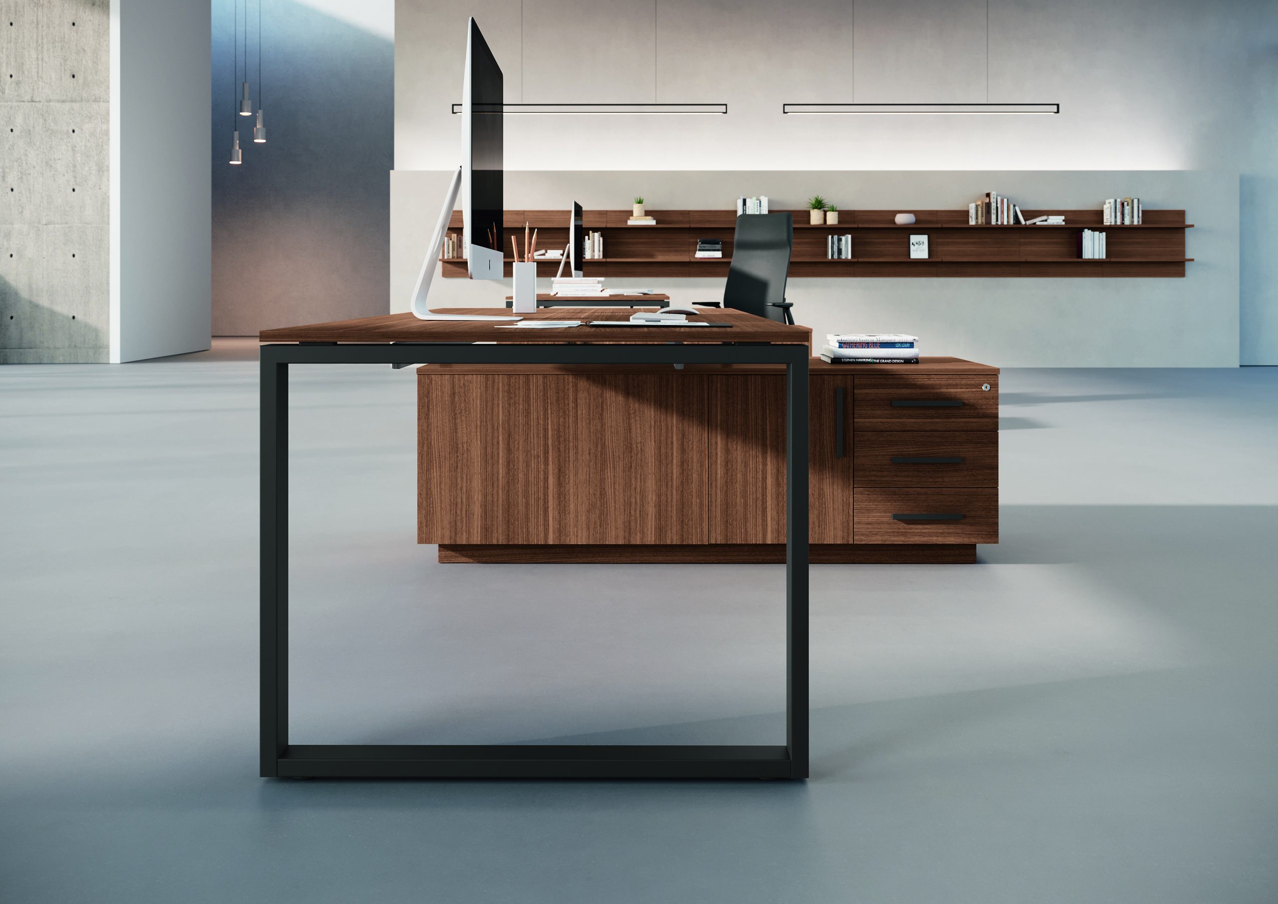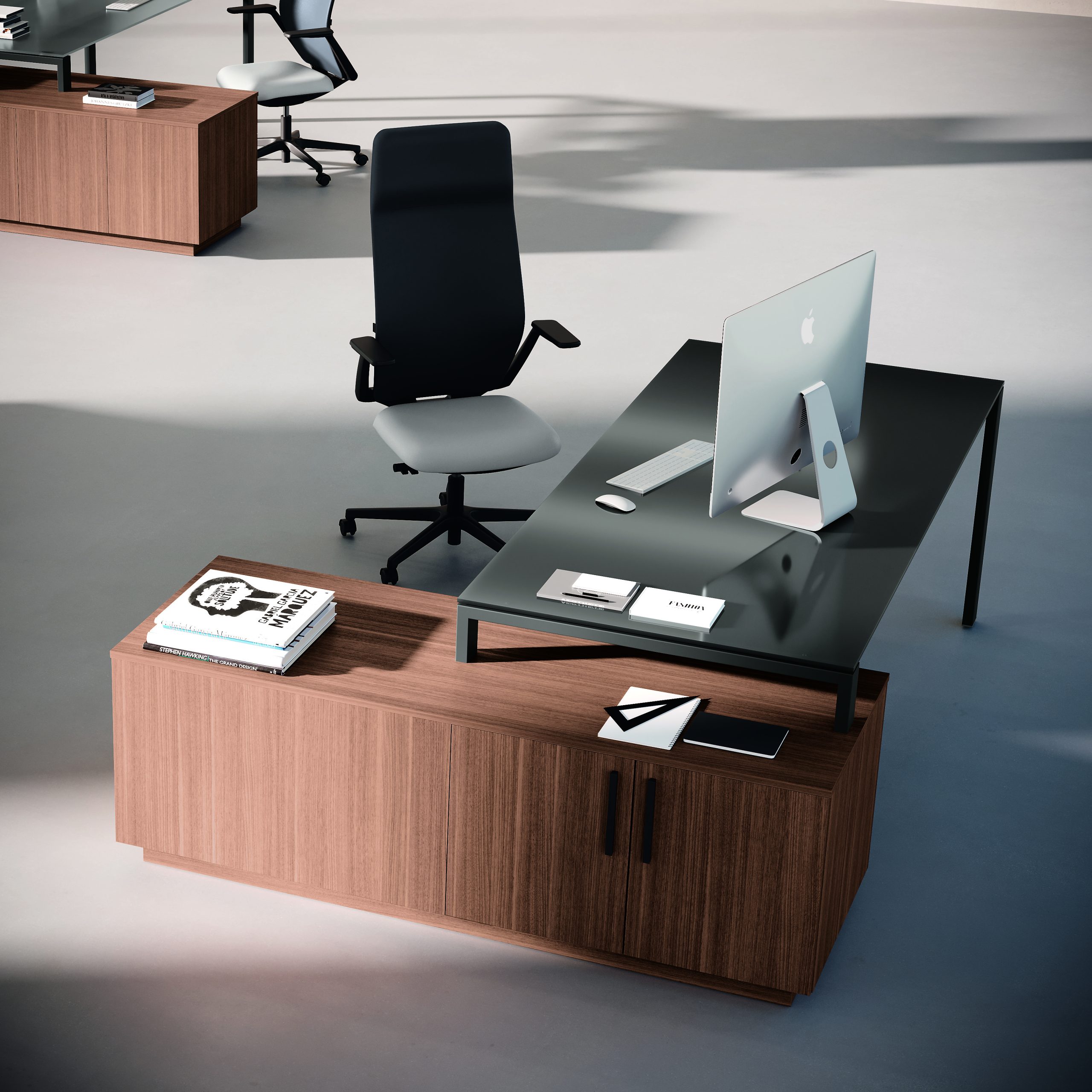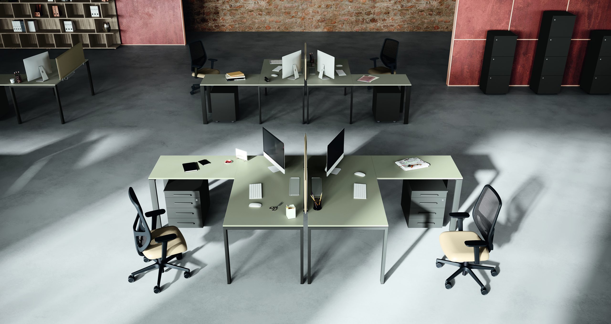 Architectural environments that look at design with interest and relaxes in the work space, invading it with colour. The symmetries of the lines coexist with the insertion of material finishes interspersed with open elements that create plays of volume characterizing the proposals described in this catalogue. Harmonious compositions declined from various elements: basic furniture, bookcases, desks with various solutions, elements with alternating volumes.