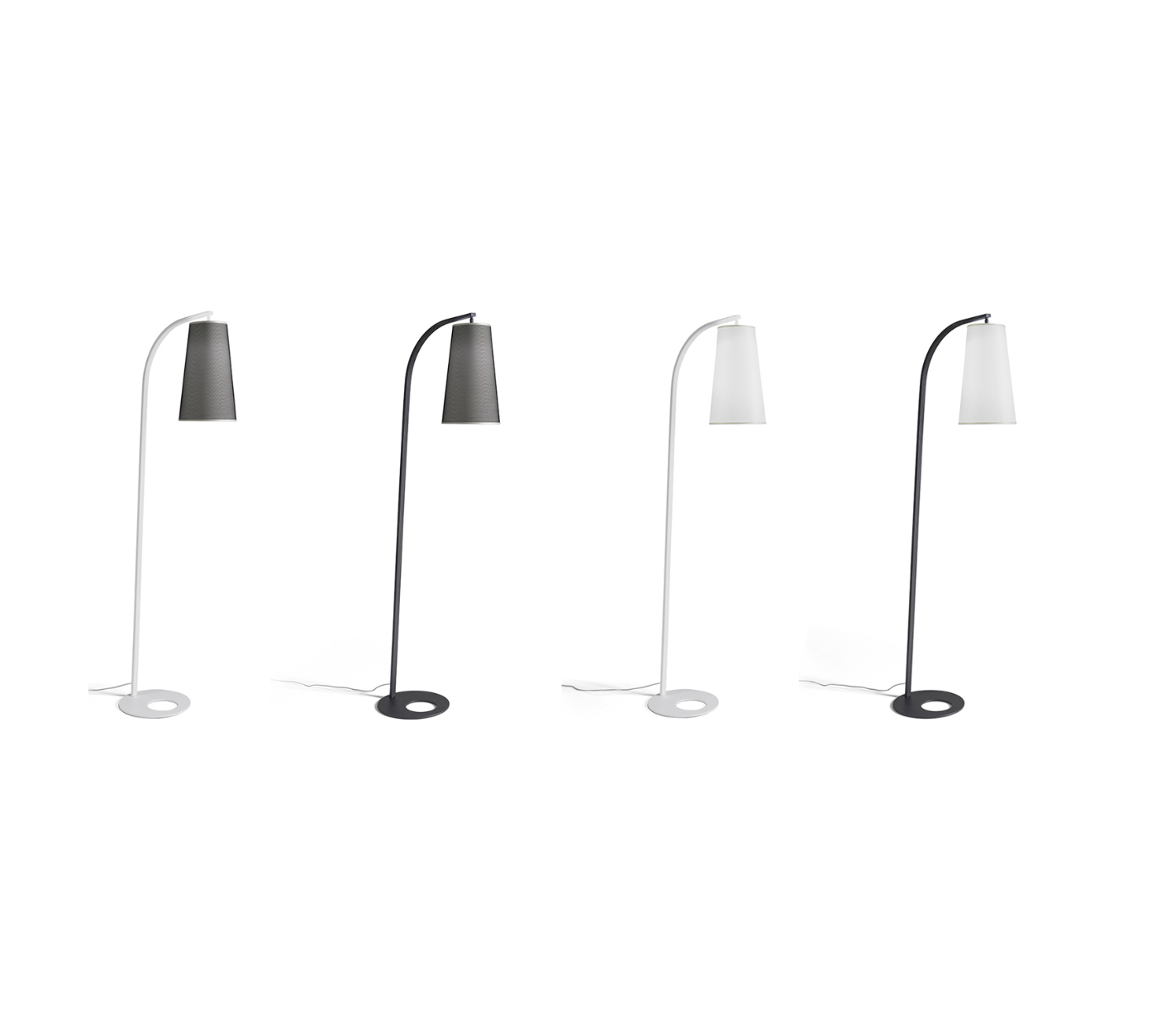 COBE is the metal structure floor lamp, available in white or graphite black. The lampshade is avaible in white or black net paired with acetate pvc, play down the lamp that lights with reverence the comfort zones.