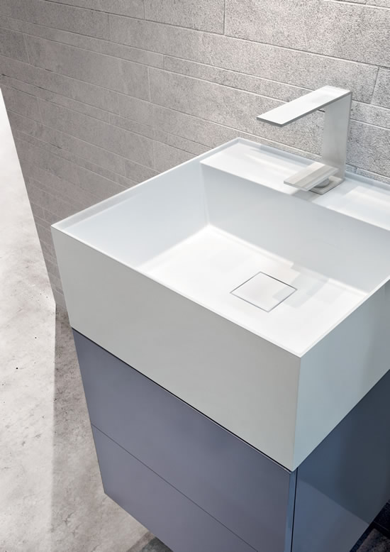 Syn is a new concept in the world of bathroom furnishings, and blends extensive modularity and essential design. The well proportioned elements, lacquered and melamine-coated, are merged to create an alternative idea of space in the bathroom.