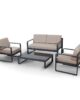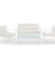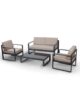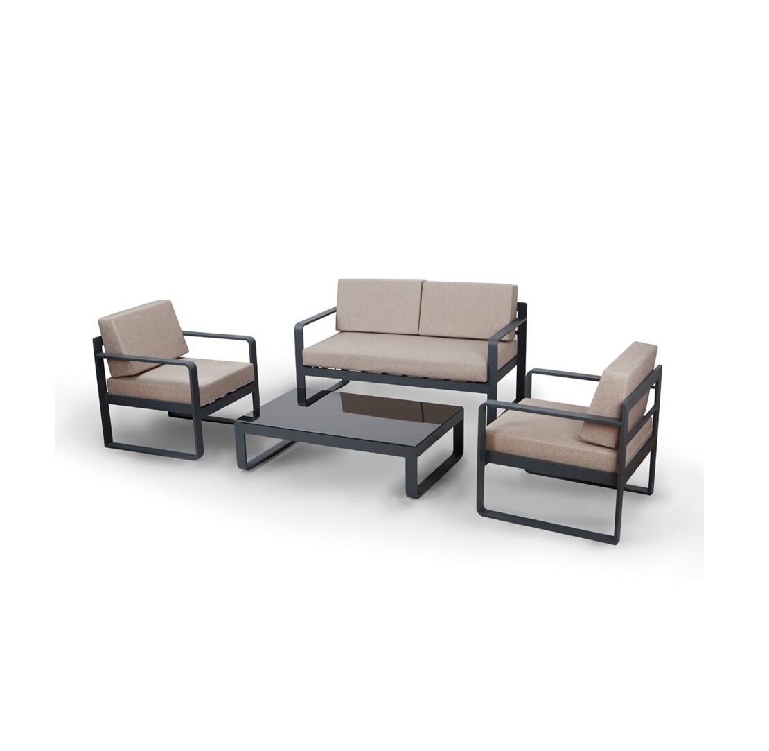 Σετ σκελετό αλουμινίου βερνικωμένο με 2 πολυθρόνες, 1 καναπέ και 1 τραπεζάκι. Μαξιλάρια με πολυεστερικό ύφασμα.