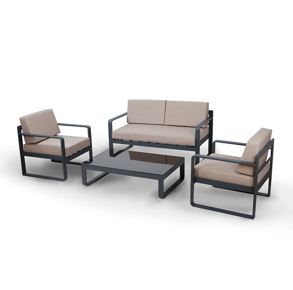 Set varnished aluminum frame with 2 armchairs ,1 sofa and 1 coffe table. Cushions with polyester fabric.