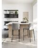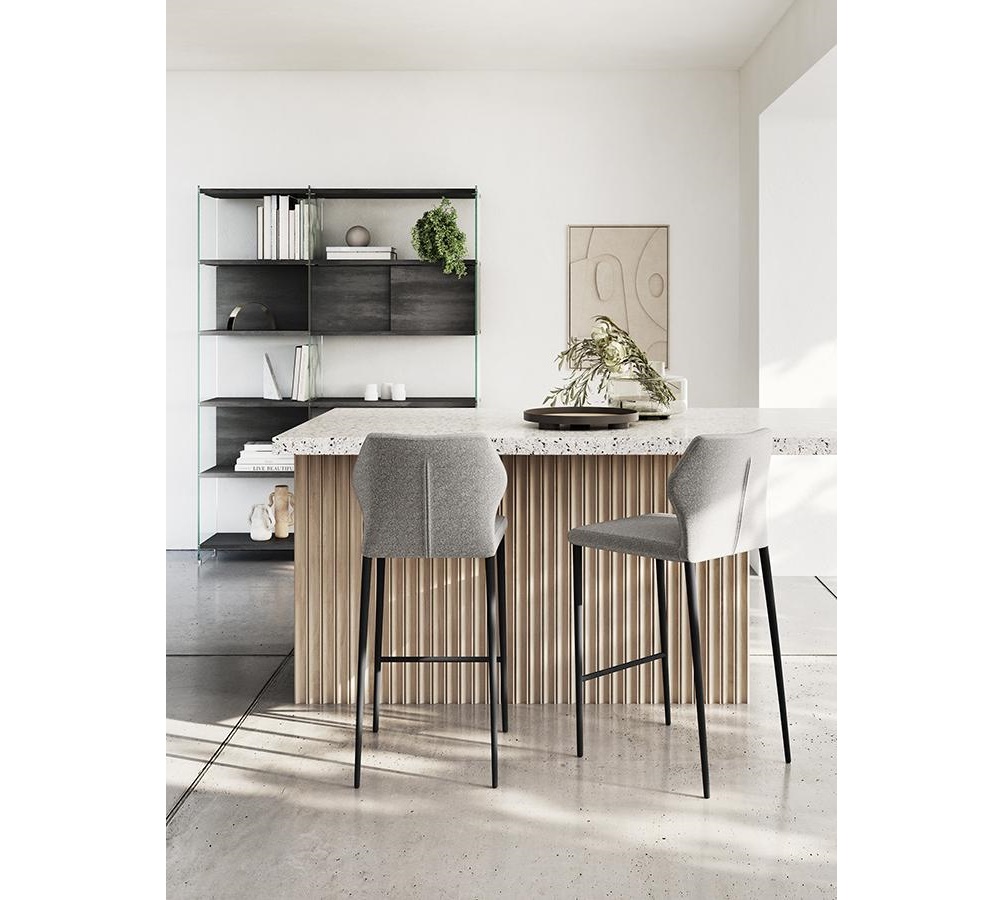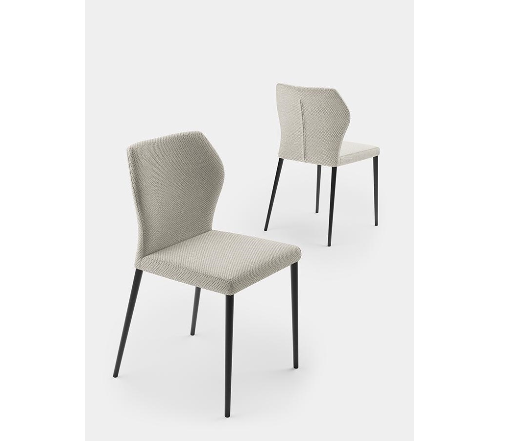 This comfortable chair has a seat made of laminate with high-density polyurethane foam padding, covered with a wide range of fabrics, real leather or imitation leather. In addition, the seat can be further customized by choosing the outside of the quilted backrest or different colors and materials between the front and back, creating unique and exclusive combinations. The structure is in tapered and sandblasted tubular round steel and the stool version is also available.