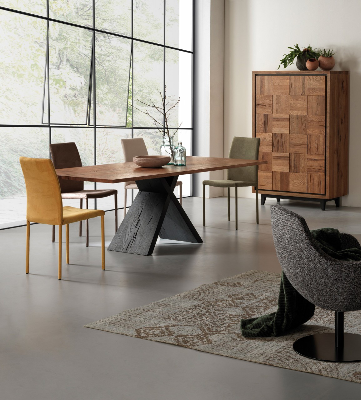 Buffalo chair made in fabric or leather, you can match them with any table from the Wild collection. Thanks to the high back they turn out to be comfortable and convenient, perfect as kitchen chairs.