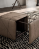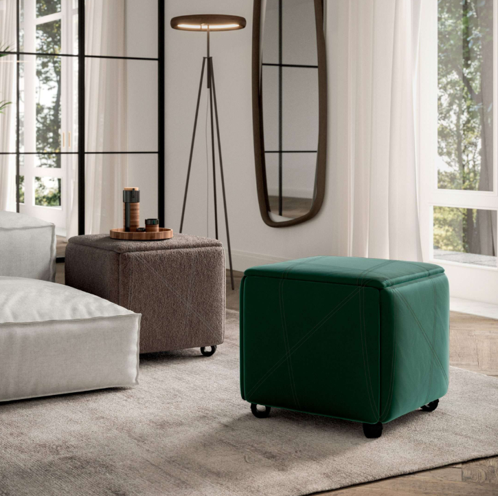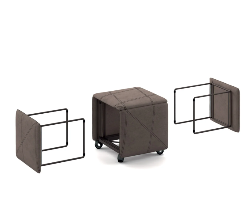 Convertible ottoman equipped with four wheels for ease of movement. Inside, it contains 4 folding chairs with padded seat and backrest.