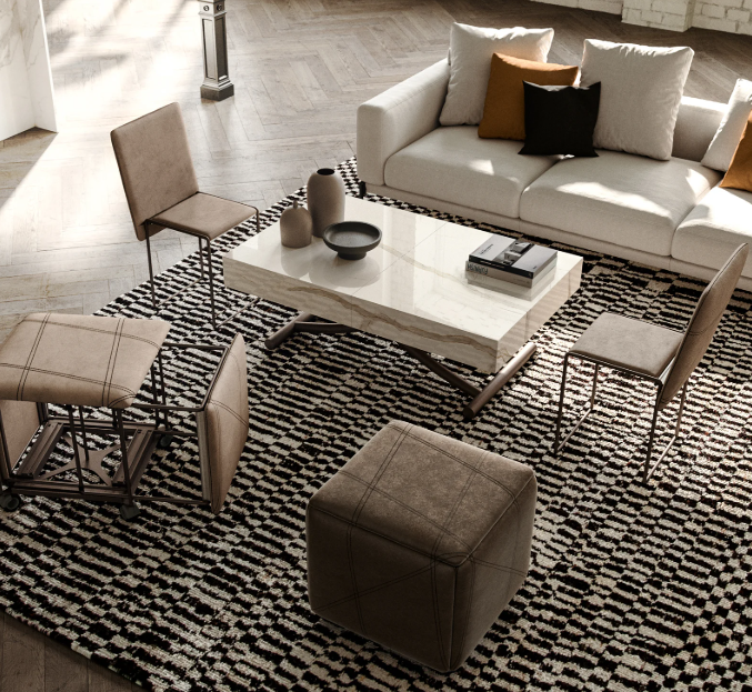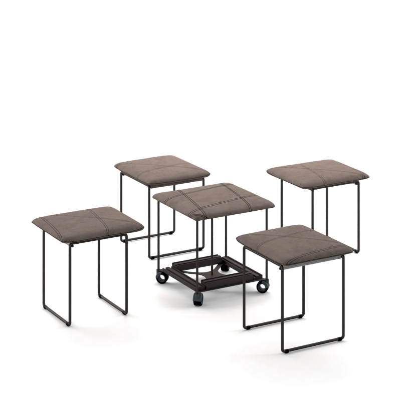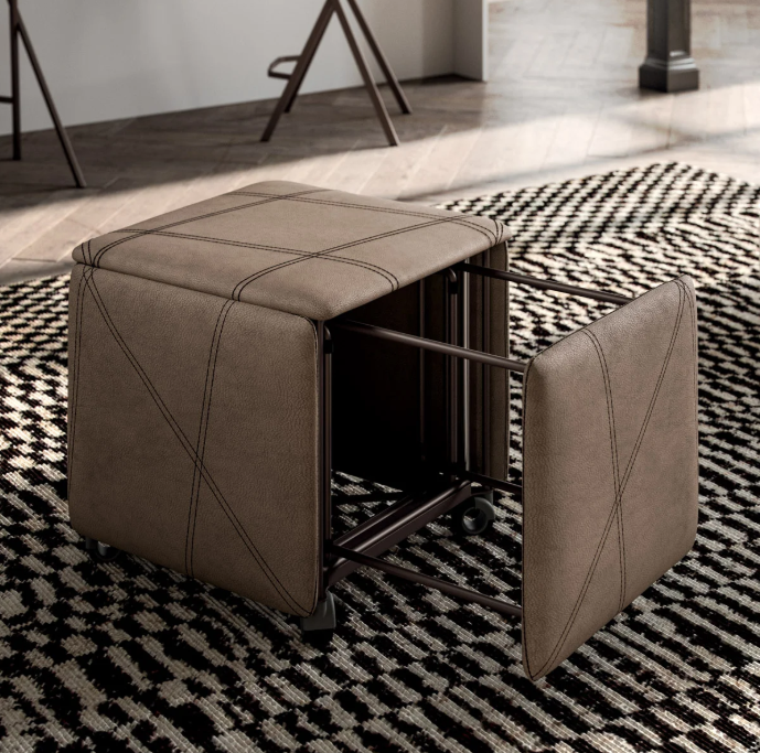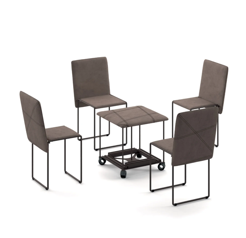 Έκπληξη, μεταμορφώσιμο, ουσιαστικό, είναι μερικά μόνο από τα επίθετα που περιγράφουν καλύτερα αυτό το καινοτόμο αντικείμενο. Η φουτουριστική μελέτη των διασταυρώσεων κρύβει πέντε καρέκλες στο εσωτερικό της, τέσσερις από τις οποίες είναι άνετες καρέκλες με επενδυμένες πλάτες. Ένα μοναδικό αντικείμενο εύκολο στη χρήση, εξοπλισμένο με τέσσερις συρόμενους τροχούς για εύκολο χειρισμό και κομψό σχεδιασμό διπλής ραφής για απλοποίηση του συστήματος ανοίγματος και κλεισίματος.