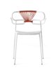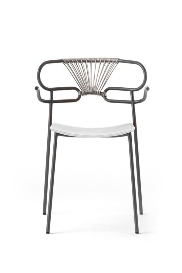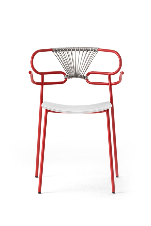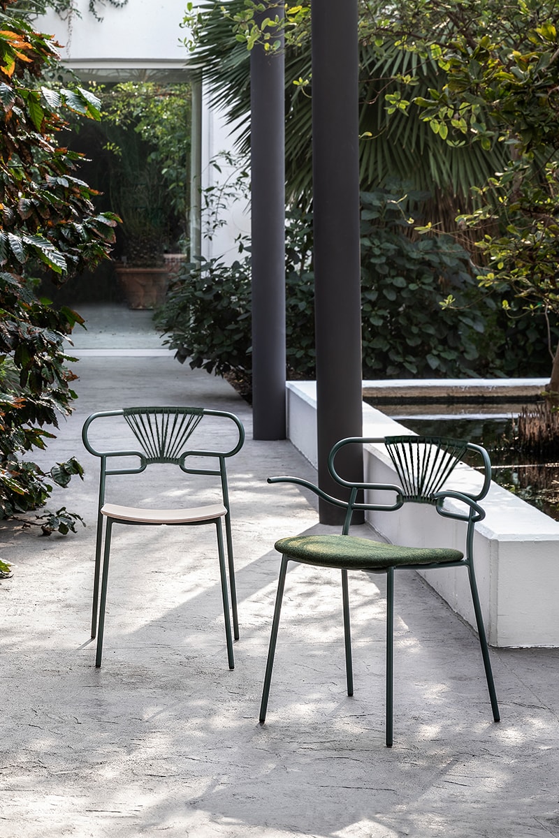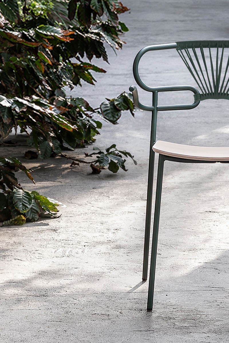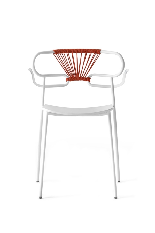 The Genoa chair collection, by talented young designer Cesare Ehr, featuring a stool and a chair with armrests, is also available in an outdoor version. The distinguishing element is the ‘one-line’ backrest, obtained by curving a single metal tube which – with its virtually endless wavy line, also extended to the armrests in this new version – is an elegant addition to every space, bringing a sense of lightness.The outdoor version of the chair will be presented at Salone del Mobile 2019. With integral body in polyurethane, mass painted in the mould, it is also available with a woven backrest in coloured rope to enhance both its look and the level of comfort provided.The frame in powder-coated tubular metal comes in a wide variety of colours; the slightly curved seat – for the indoor versions – is in ash wood (left au naturel or painted) or upholstered with various fabrics, leather or eco-leather.