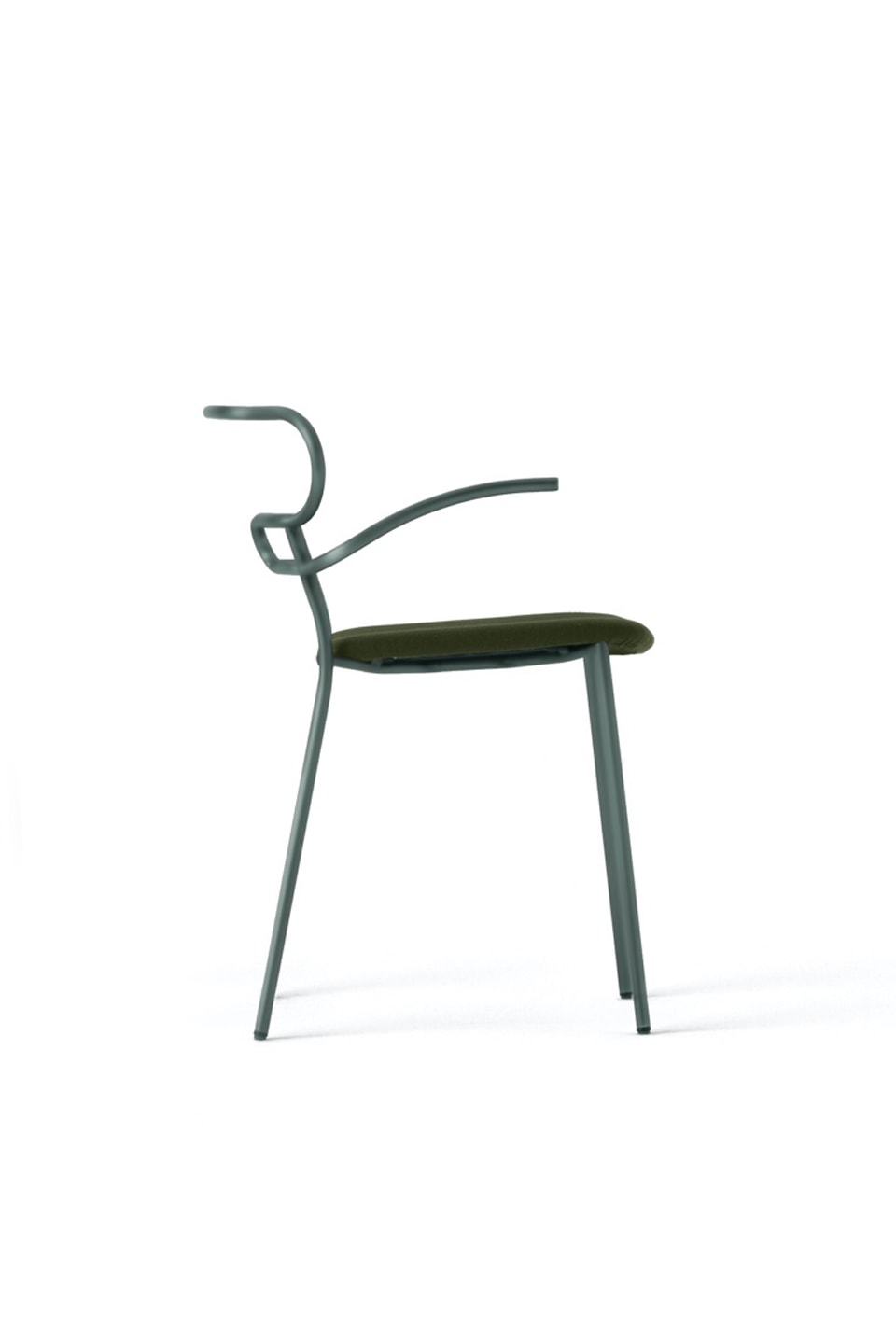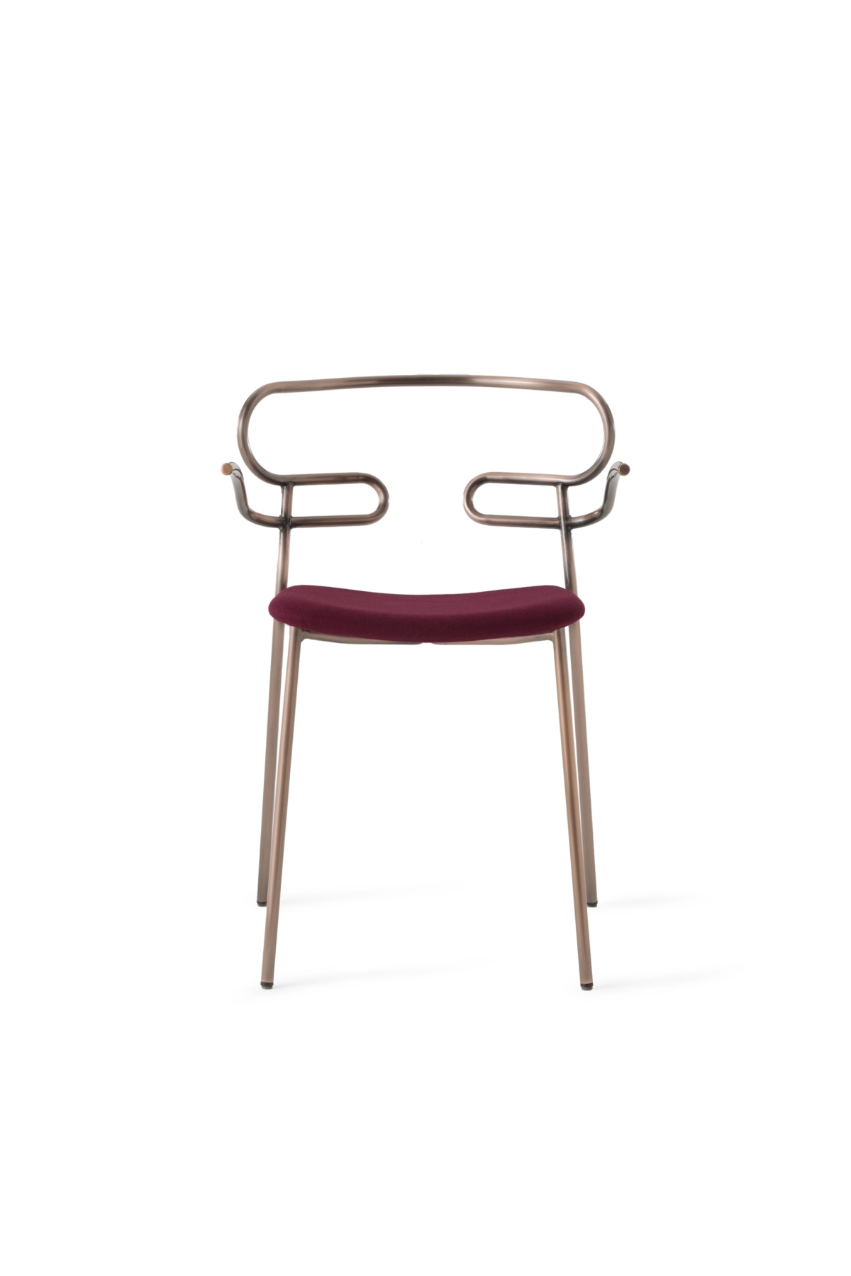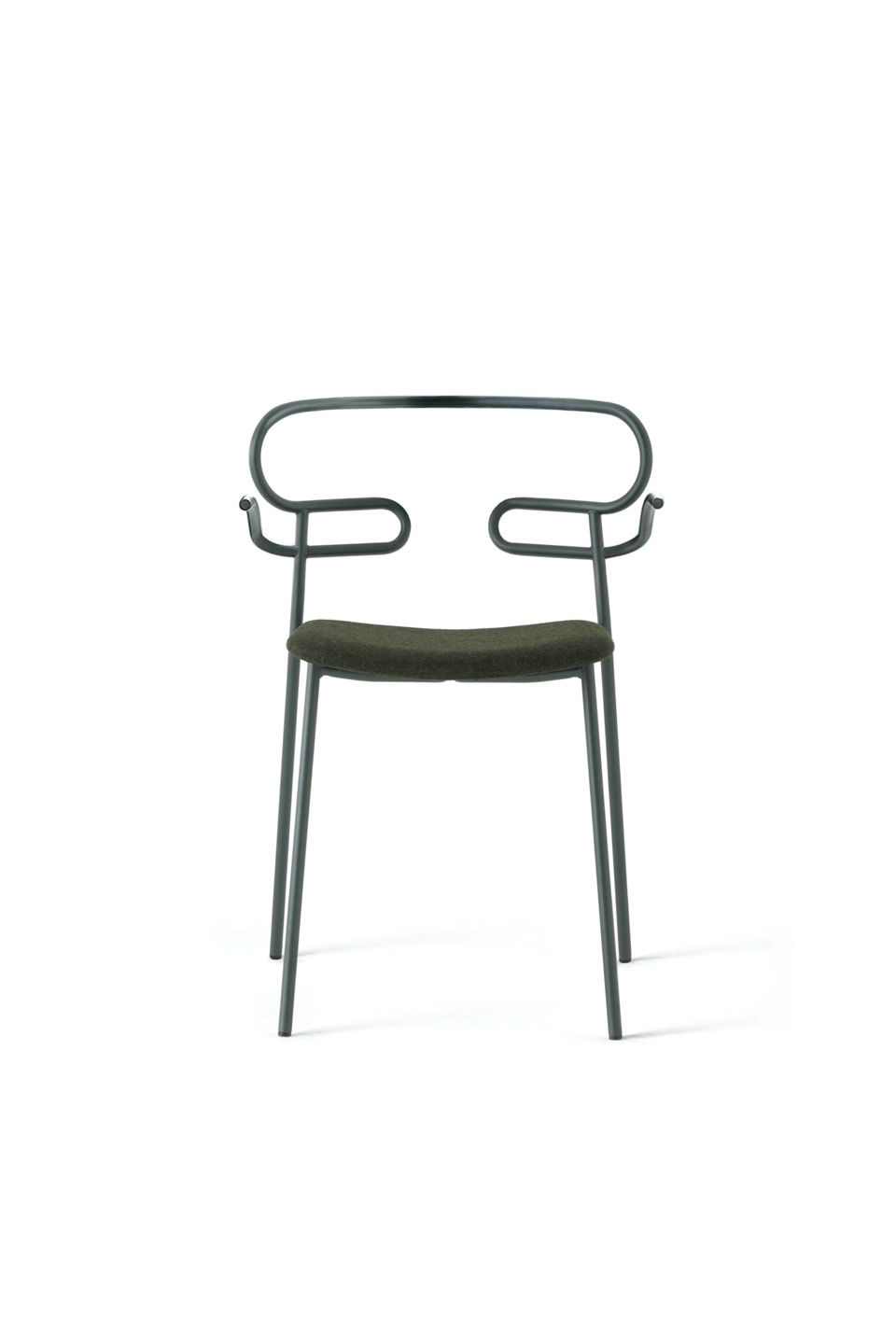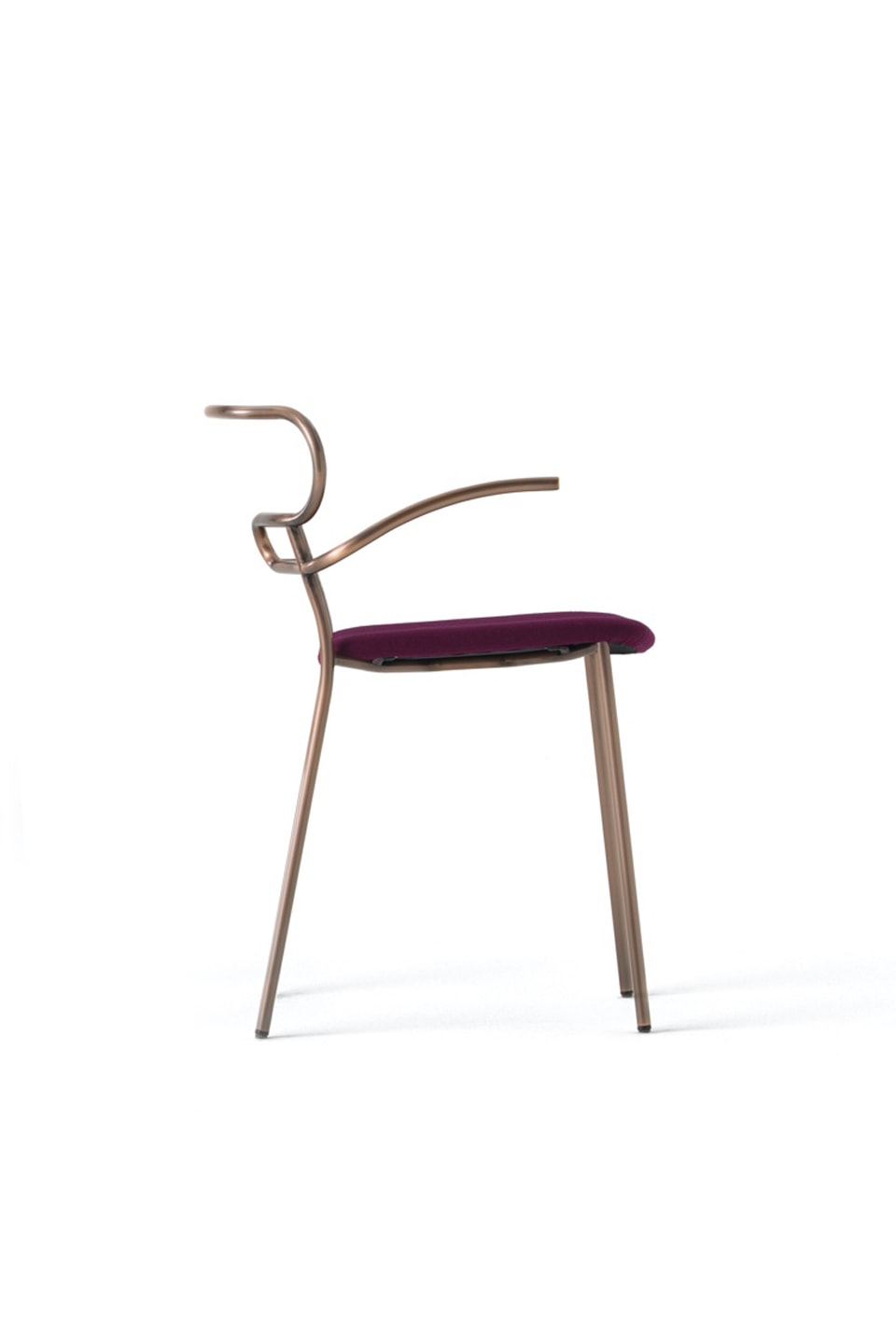 The Genoa seating collection, designed by the young Cesare Ehr, is expanding with the stool and chair with armrests versions, also in the outdoor variant. The characterizing element is the ‘one line’ backrest, obtained from the curvature of a single metal tube which – with its virtually infinite sinuous line, extended into this new version in the armrests – fits discreetly into any space, connoting it with lightness. At the Salone del Mobile 2019 the outdoor version of the seats is presented – with a body in integral polyurethane painted in the mass and in the mold – also available with a backrest woven with colored rope, which enhances, in addition to aesthetics, the level of comfort. The powder-coated metal tubular structure is available in a wide range of colors; the slightly curved seat – for the indoor versions – is in ash wood (natural or painted), or padded with different fabrics, leather or eco-leather.