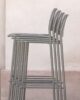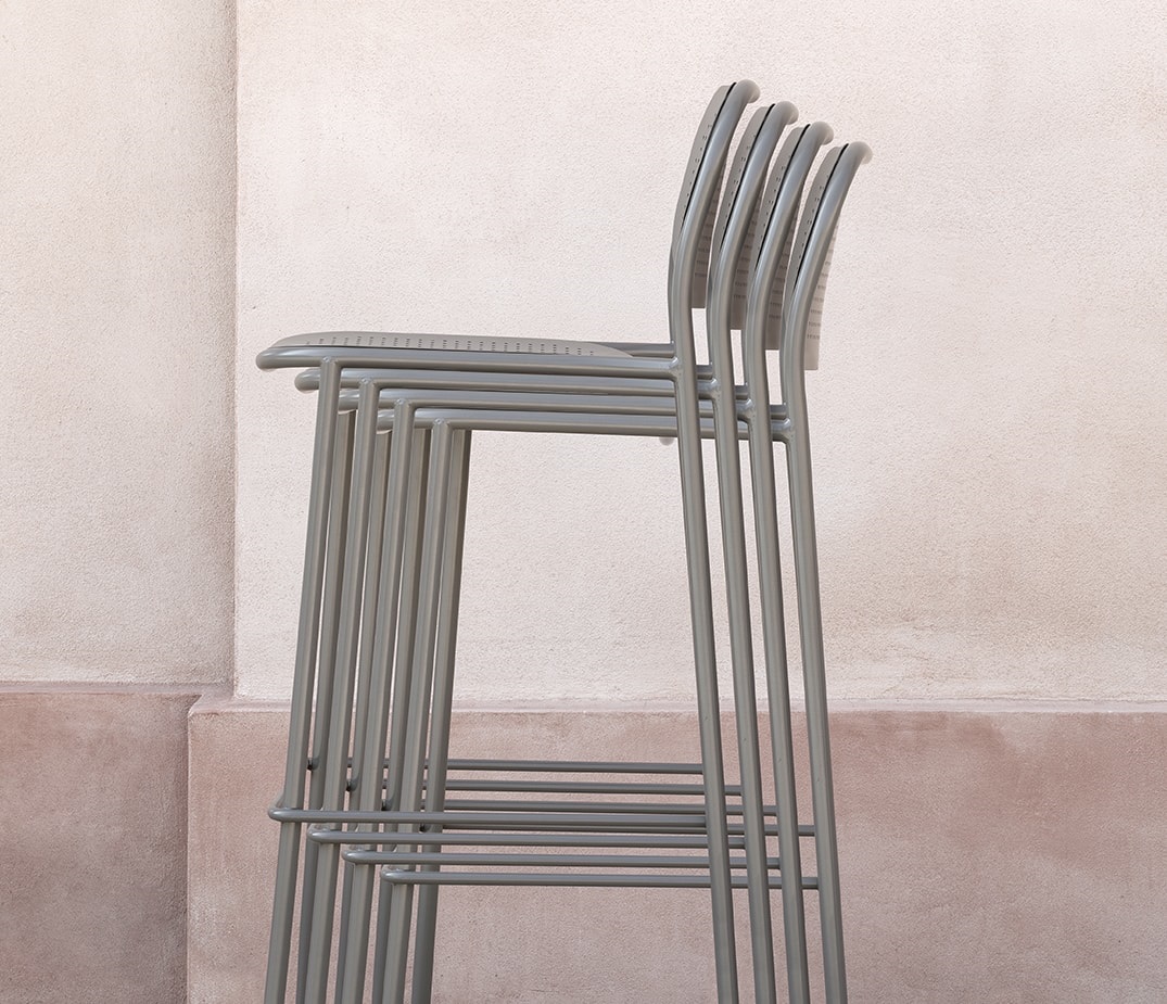 The collection includes the chair with or without armrest, the lounge version with or without armrest and the stool in two heights. In all its variants, the tubular metal structure is completed by the seat and back in sheet metal with perforated weft and rounded shapes, which reinterpret the classic Viennese weaving in a modern key. Available in all standard and special colors, Metis Dot furnishes indoor and outdoor environments with the unique style that distinguishes it.