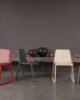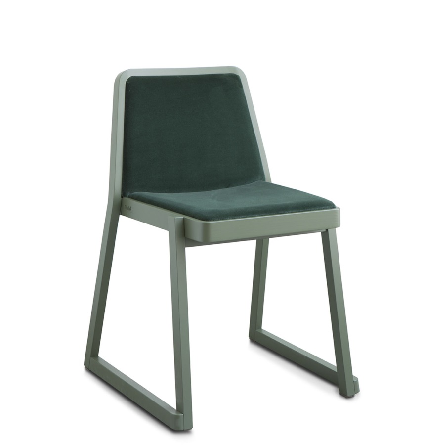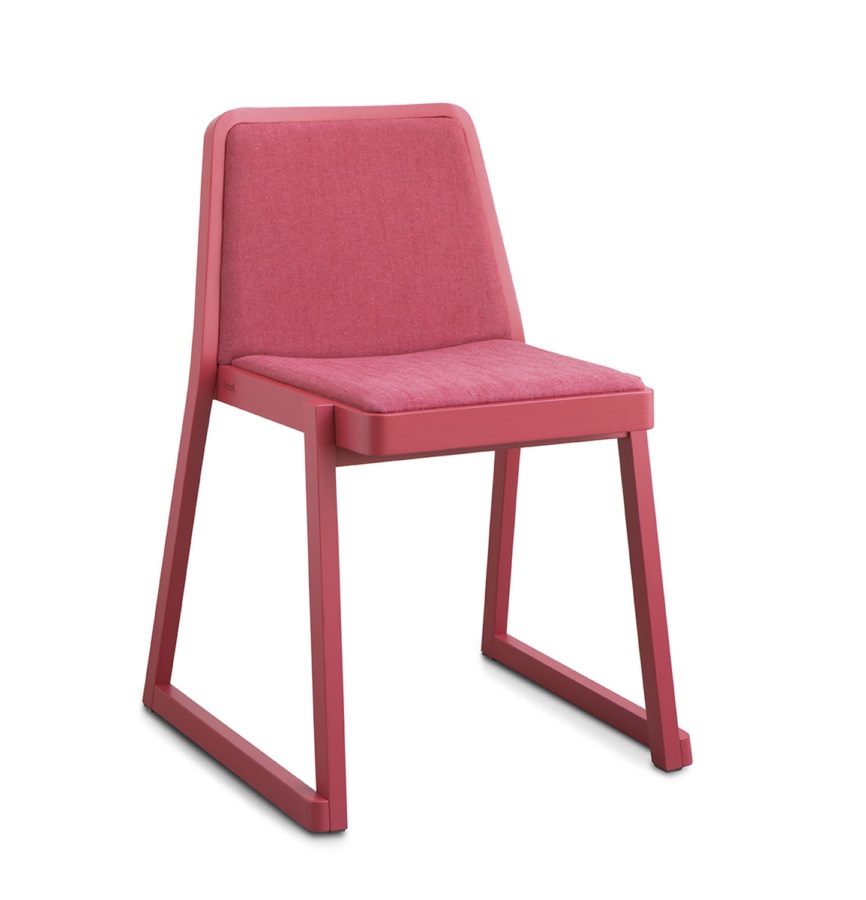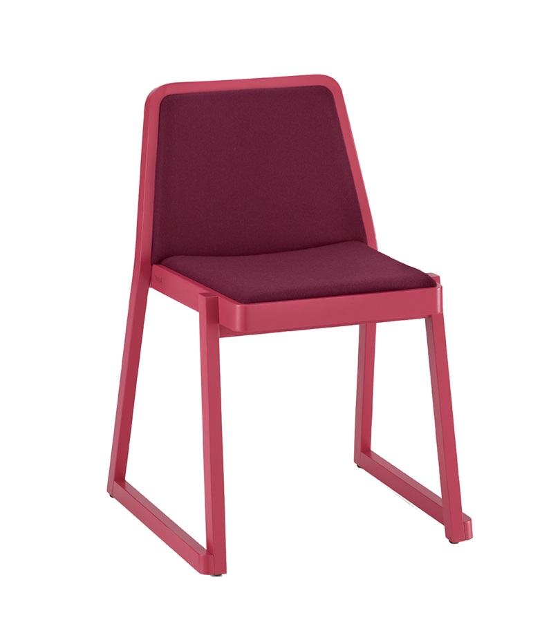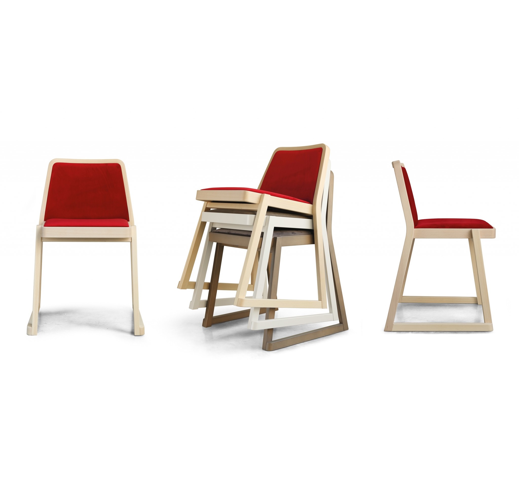 Roxanne is a chair encompassing all the requirements of an iconic object: a strong personality, simplicity of design, and flawless functionality and image. The perfectly calibrated seat and backrest provide excellent comfort. Roxanne is a stackable chair, and therefore lends itself for use in public areas, such as conference halls and meeting rooms. It comes with a beech frame and slanting geometrical lines to ensure maximum stability and ergonomics.The frame, seat and backrest are in beech, either bleached, natural or lacquered in a very wide range of shades. The seat and backrest are padded and upholstered in fabric, velvet, leather, faux leather, or flame retardant Trevira textiles.