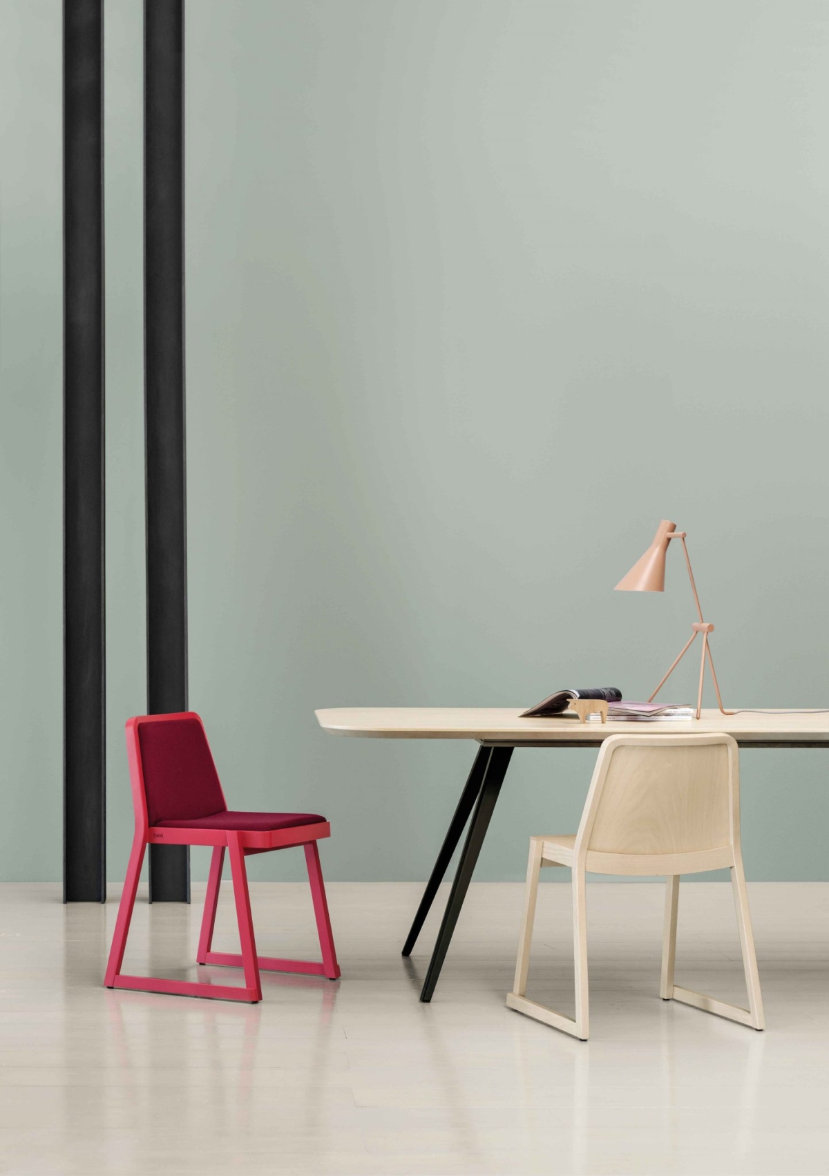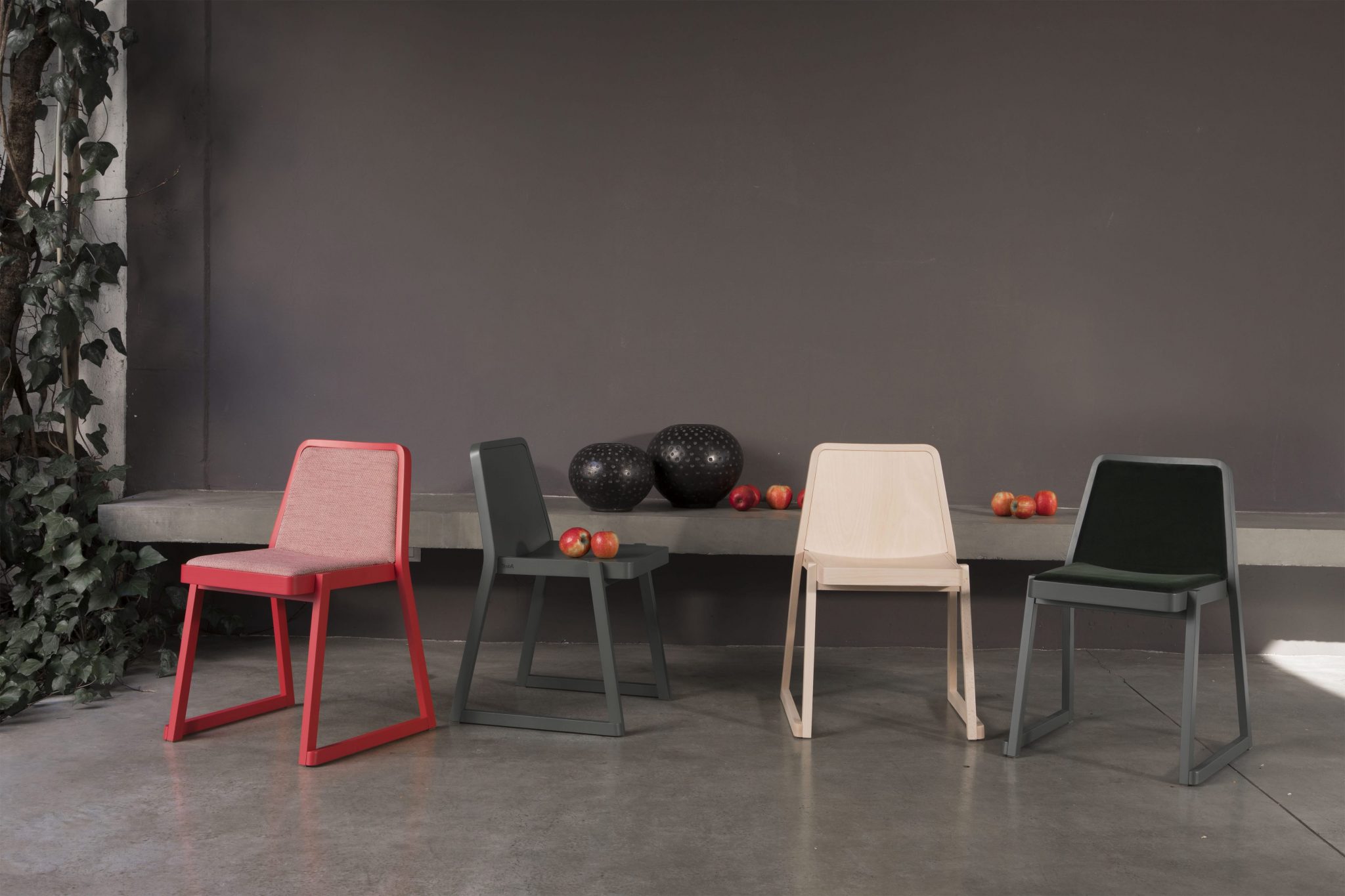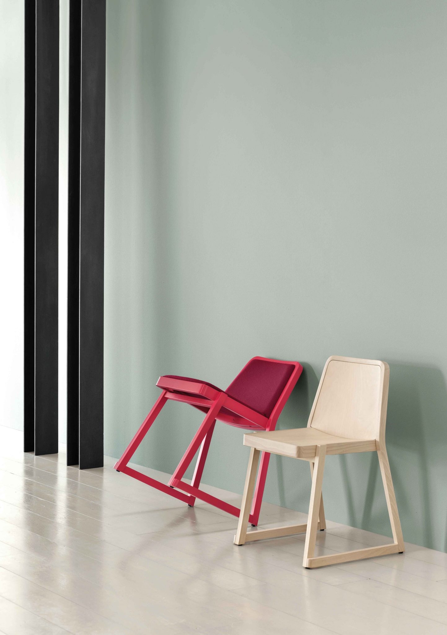 Roxanne is a chair encompassing all the requirements of an iconic object: a strong personality, simplicity of design, and flawless functionality and image. The perfectly calibrated seat and backrest provide excellent comfort. Roxanne is a stackable chair, and therefore lends itself for use in public areas, such as conference halls and meeting rooms. It comes with a beech frame and slanting geometrical lines to ensure maximum stability and ergonomics.The frame, seat and backrest are in beech, either bleached, natural or lacquered in a very wide range of shades. The seat and backrest are padded and upholstered in fabric, velvet, leather, faux leather, or flame retardant Trevira textiles.