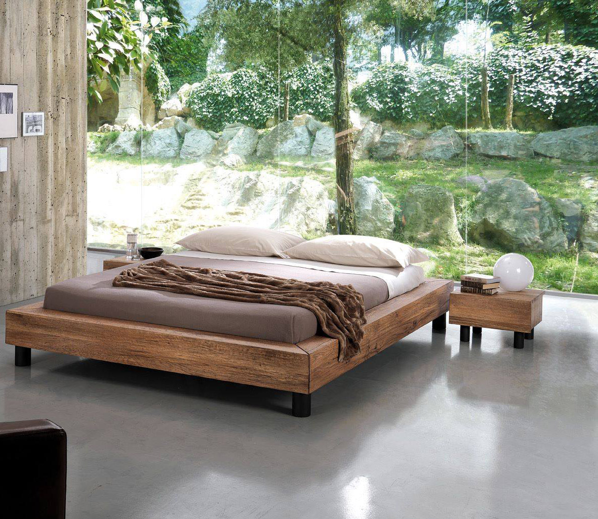 Combine the Letto bed with its solid turkey oak night stand, thanks to its drawer built into the frame, it is convenient and spacious. For a raised-off-the-floor effect, opt for glass feet; for something more simple but impressive, opt for metal feet.