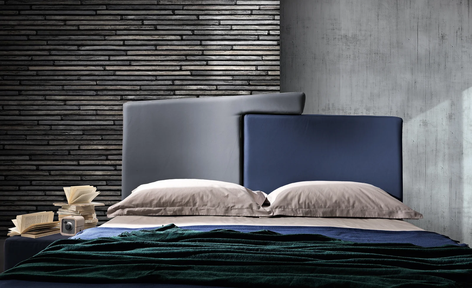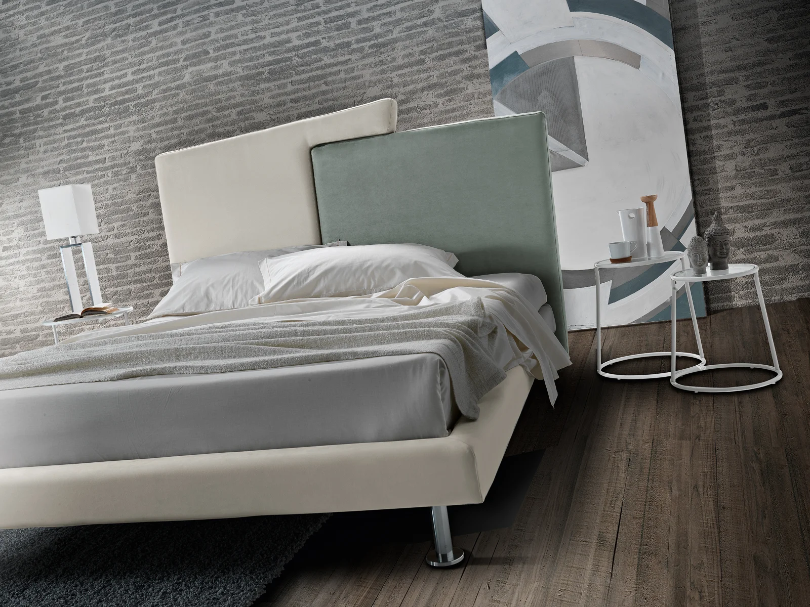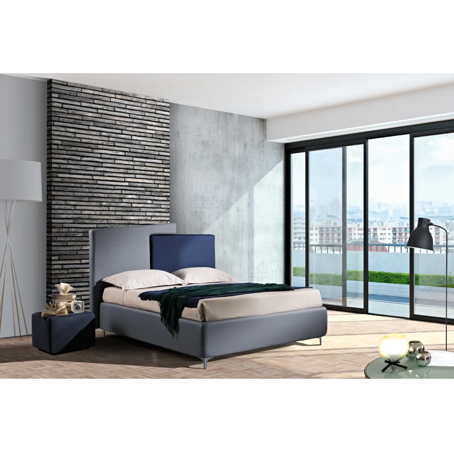 Plot is a high design bed, characterized by simple and geometric lines. The headboard is composed of two trapezoids that meet in a warm embrace. The colors can be customized in a two-color or monochromatic version.