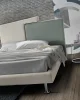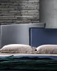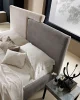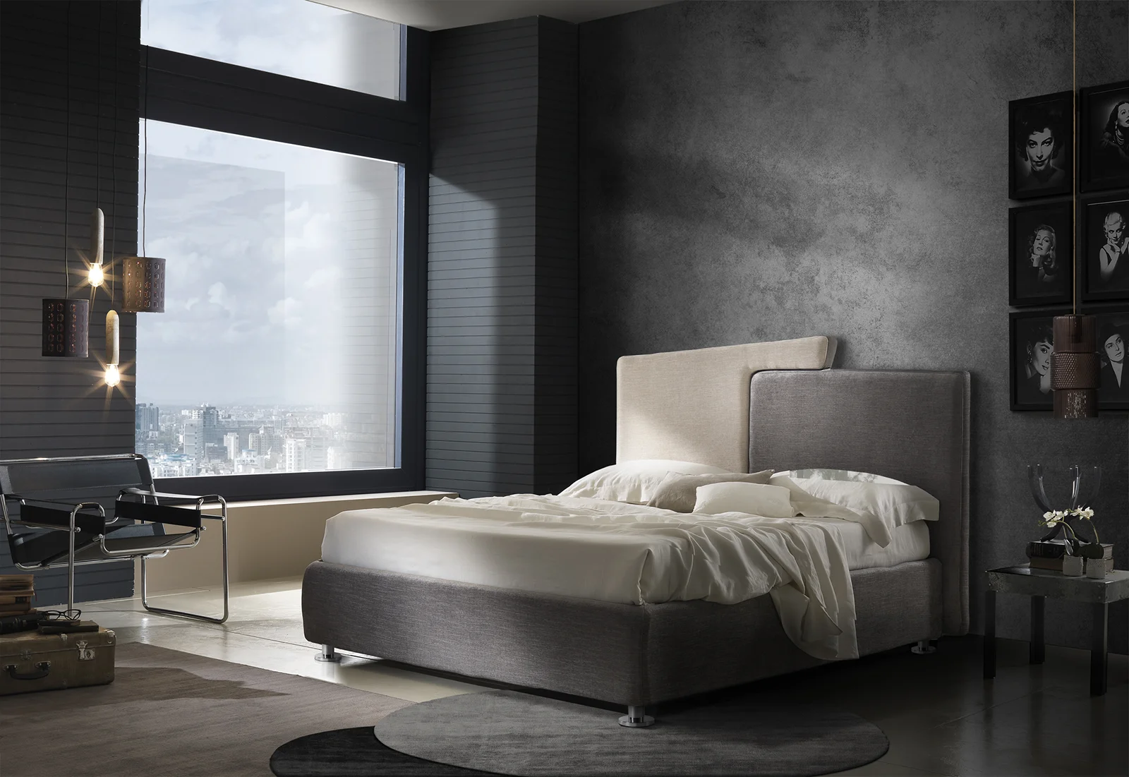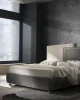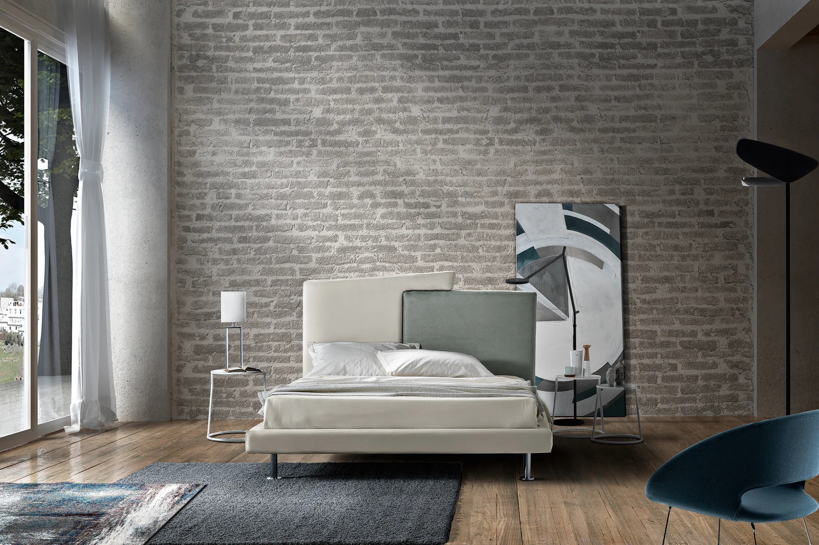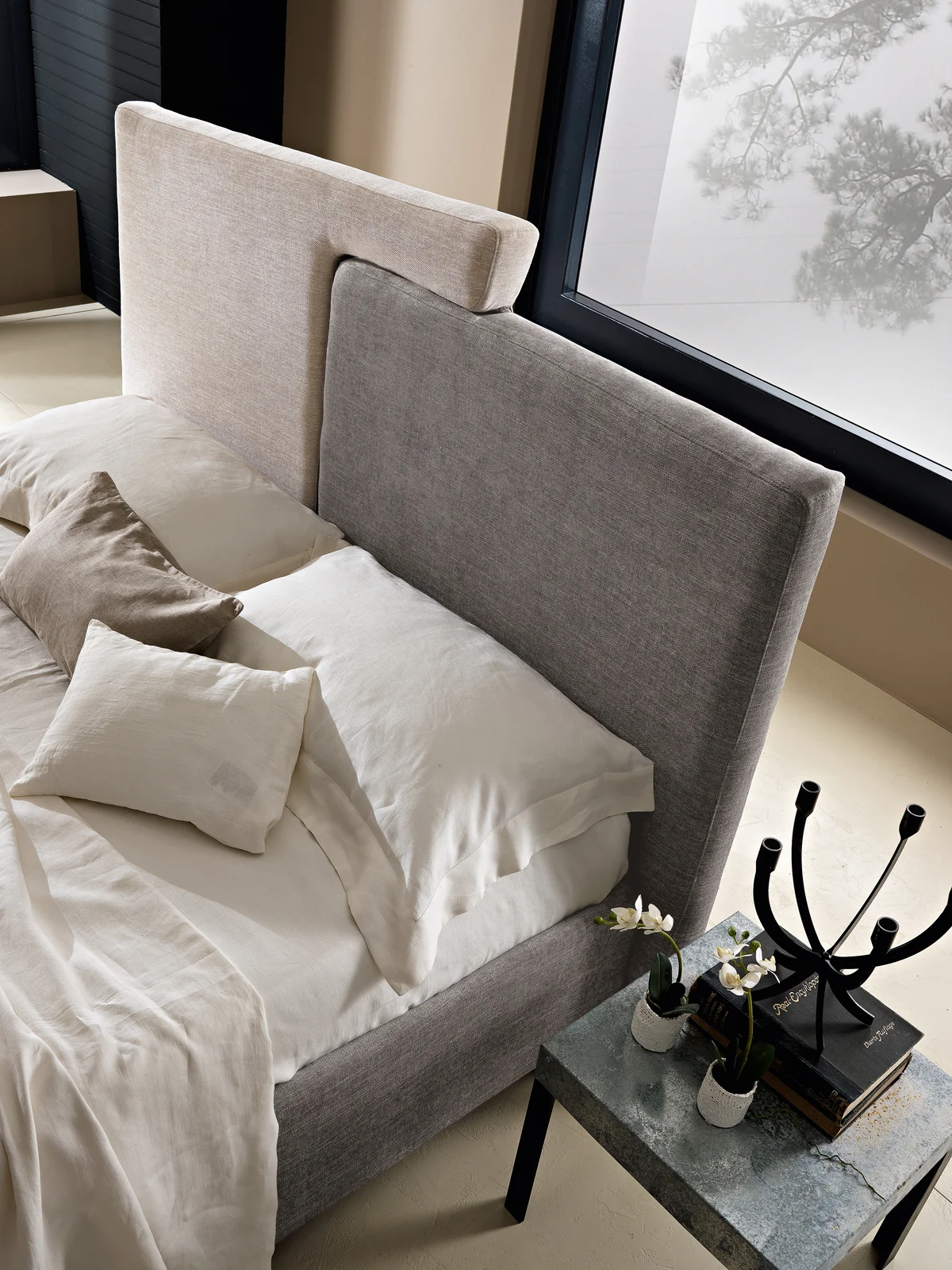 Plot is a high design bed, characterized by simple and geometric lines. The headboard is composed of two trapezoids that meet in a warm embrace. The colors can be customized in a two-color or monochromatic version.