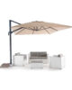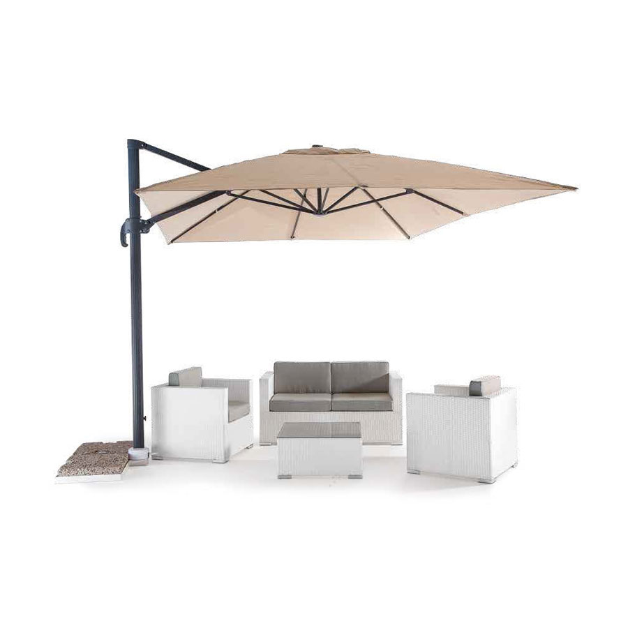 Αναδιπλούμενη ομπρέλα με δομή αλουμινίου, νευρώσεις αλουμινίου και επικαλυμμένη από ύφασμα Olefin με υδατοαπωθητική επίστρωση. Ανοιγόμενος πρόβολος. Σύστημα περιστροφής 360°. Δεν περιλαμβάνεται έρμα.