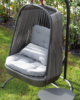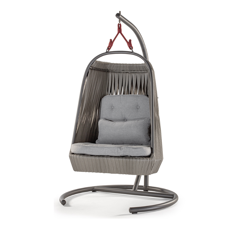 Hanging armchair with aluminium varnished frame and weaved with eco wicker rope. Cushions upholstered , acrylic fabric.