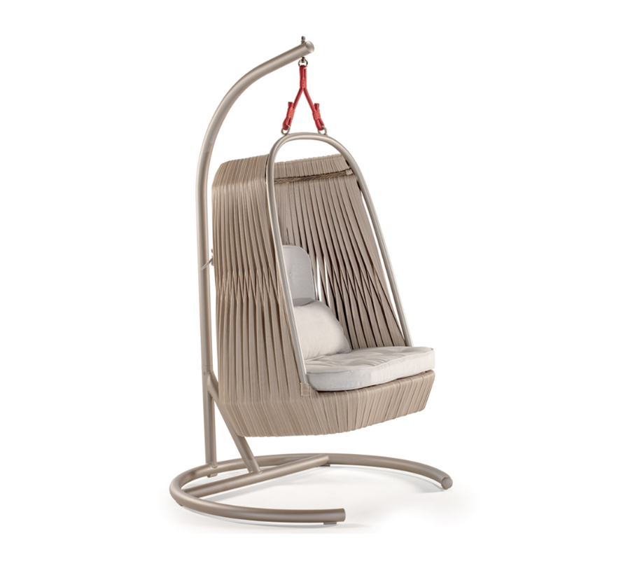 Κρεμαστή πολυθρόνα με σκελετό αλουμινίου βερνικωμένο και πλεκτό με οικολογικό ψάθινο σχοινί. Μαξιλάρια με επένδυση, ακρυλικό ύφασμα.