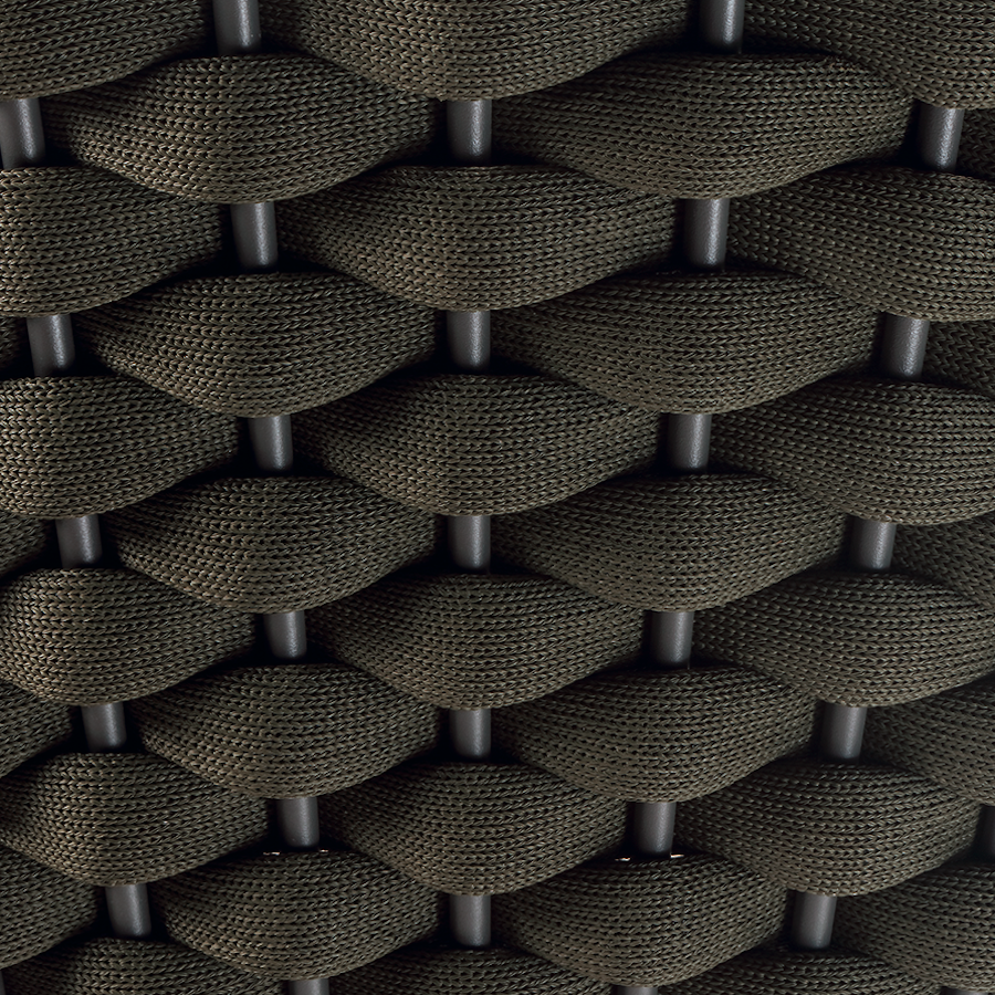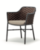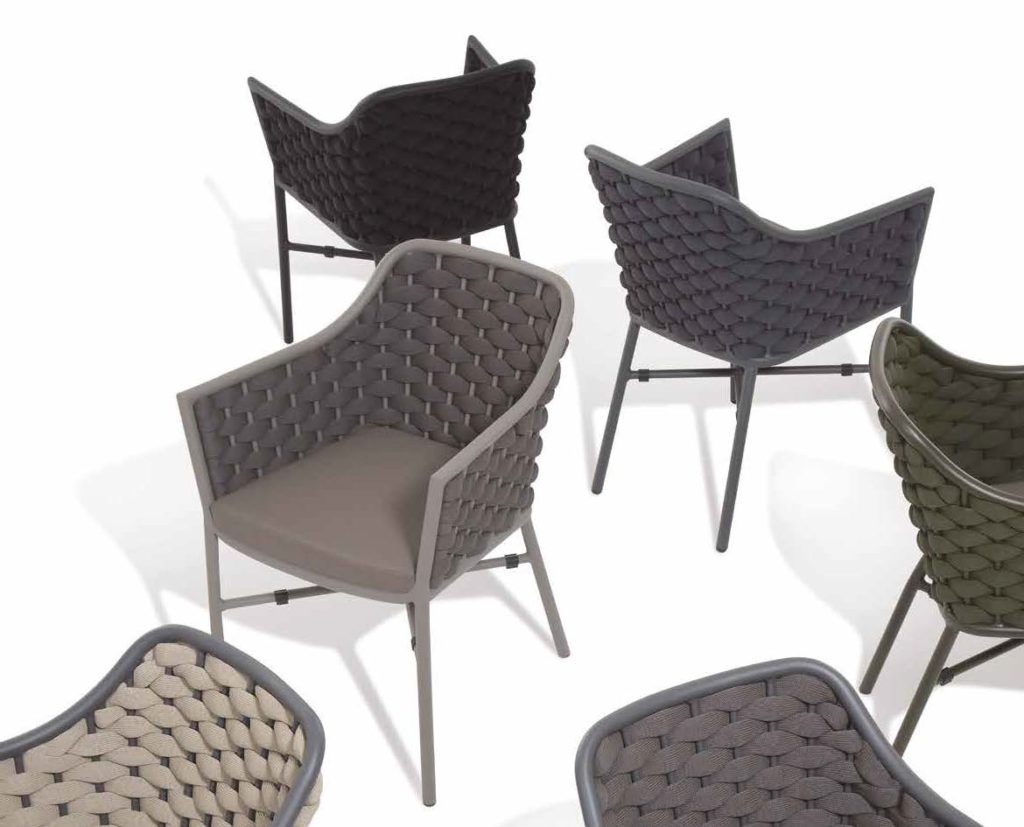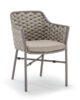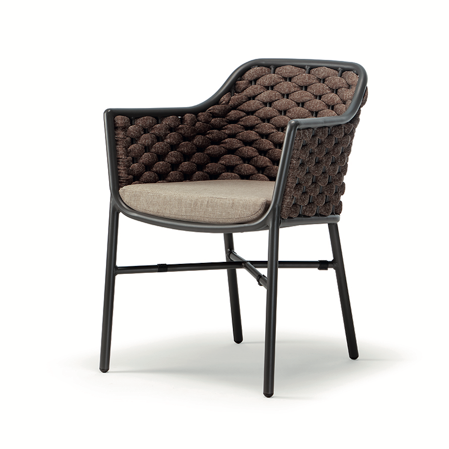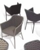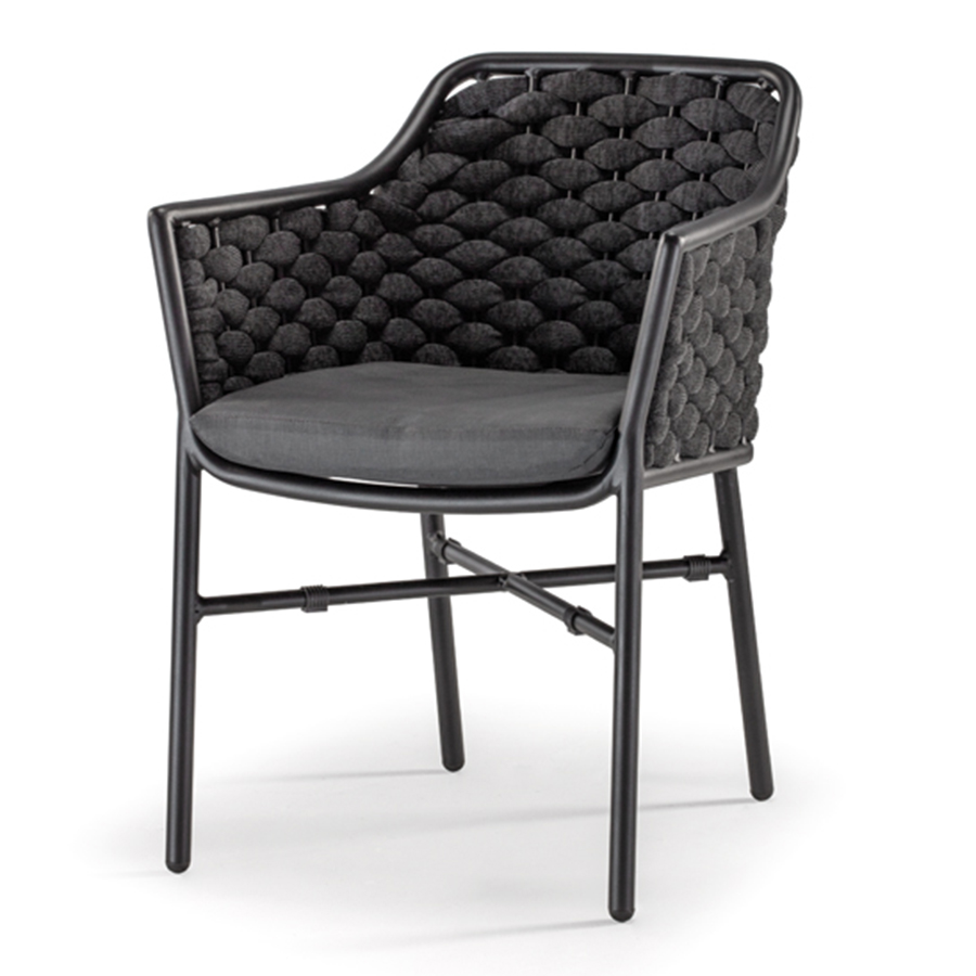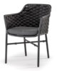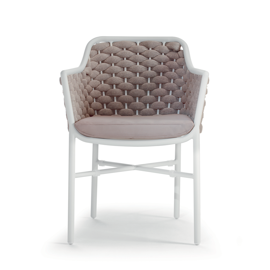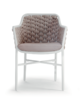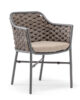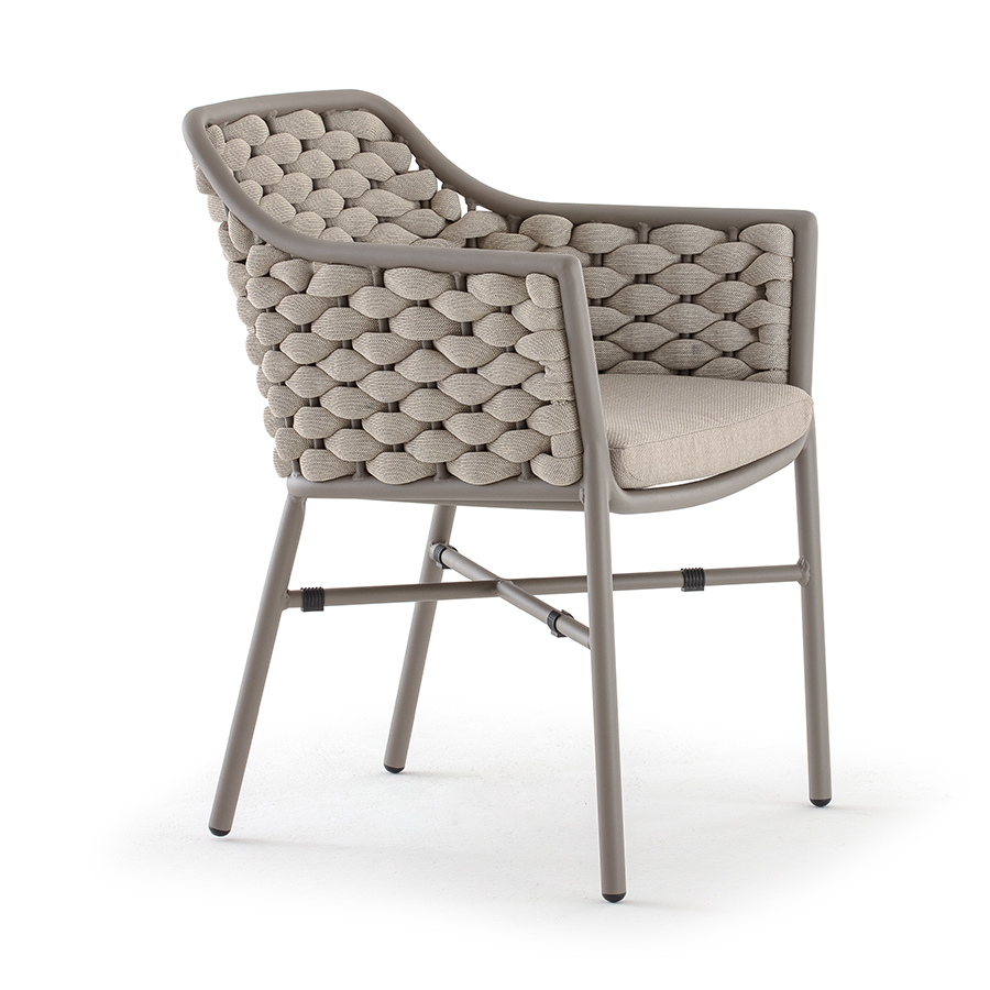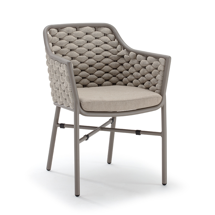 Aluminium stackable armchair covered with textylene and rubber rope. Textylene or acrylic cushion