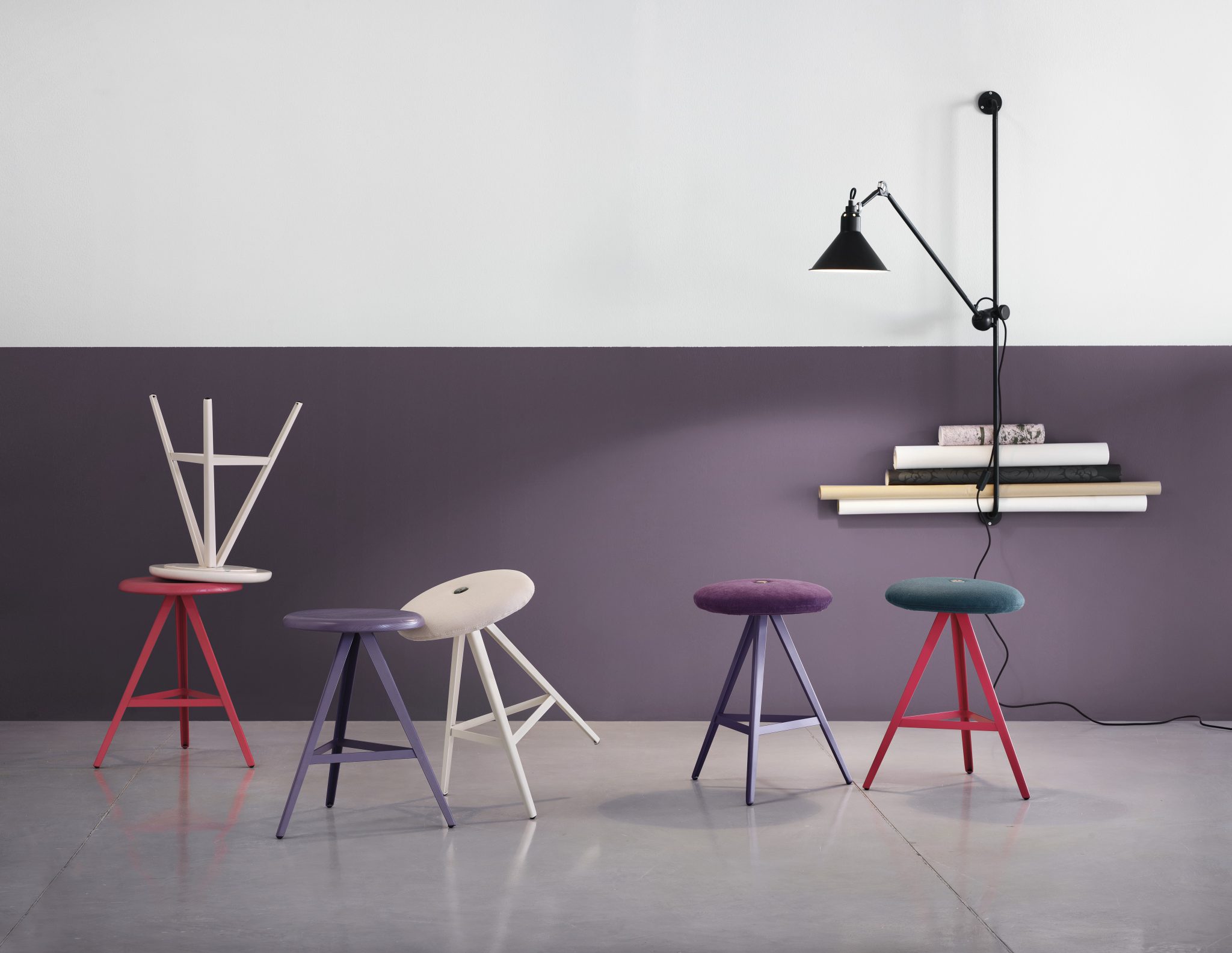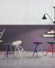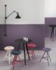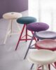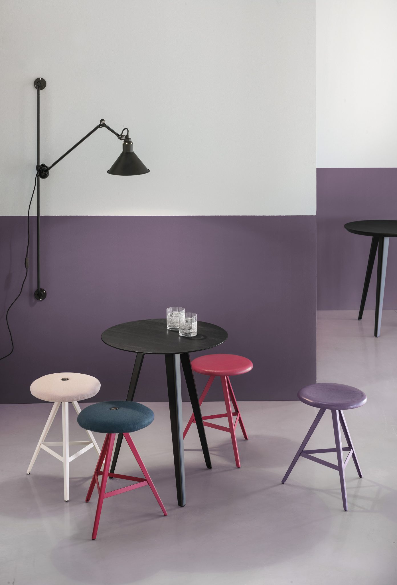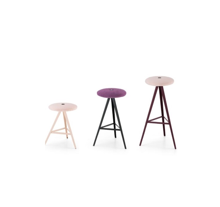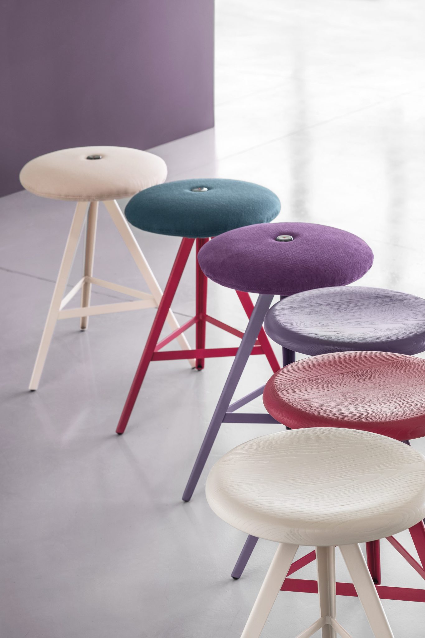 Newcomer in the Aky Contract collection: The Aky stool, available in three different heights, completes the collection, making it perfect for turnkey projects in the contract sector.Like the collection’s tables, the Aky stools are supported by legs that meet at the centre, giving a sense of tapering lightness. The round wooden seat is also available in an upholstered padded version featuring a coloured central button.