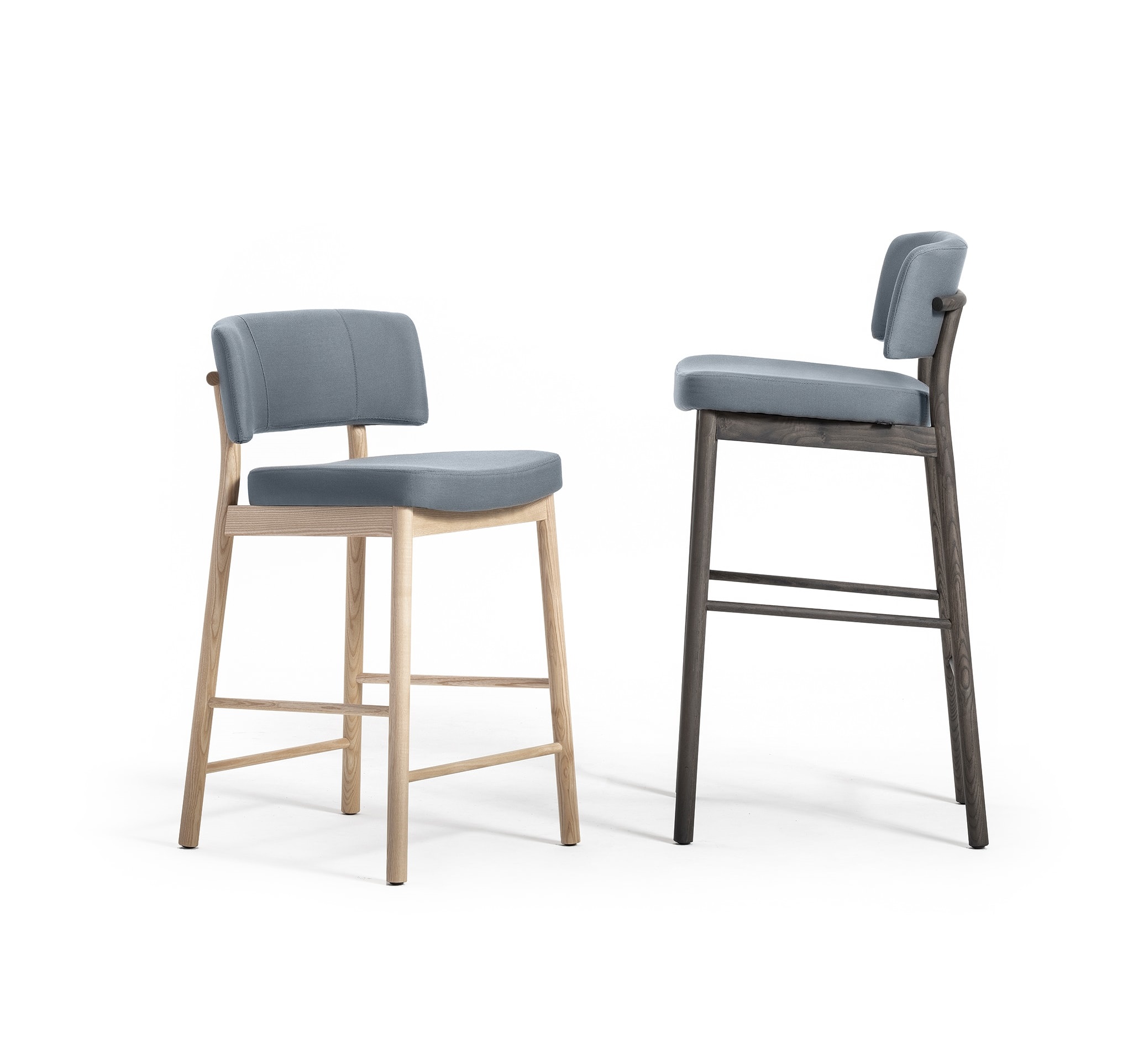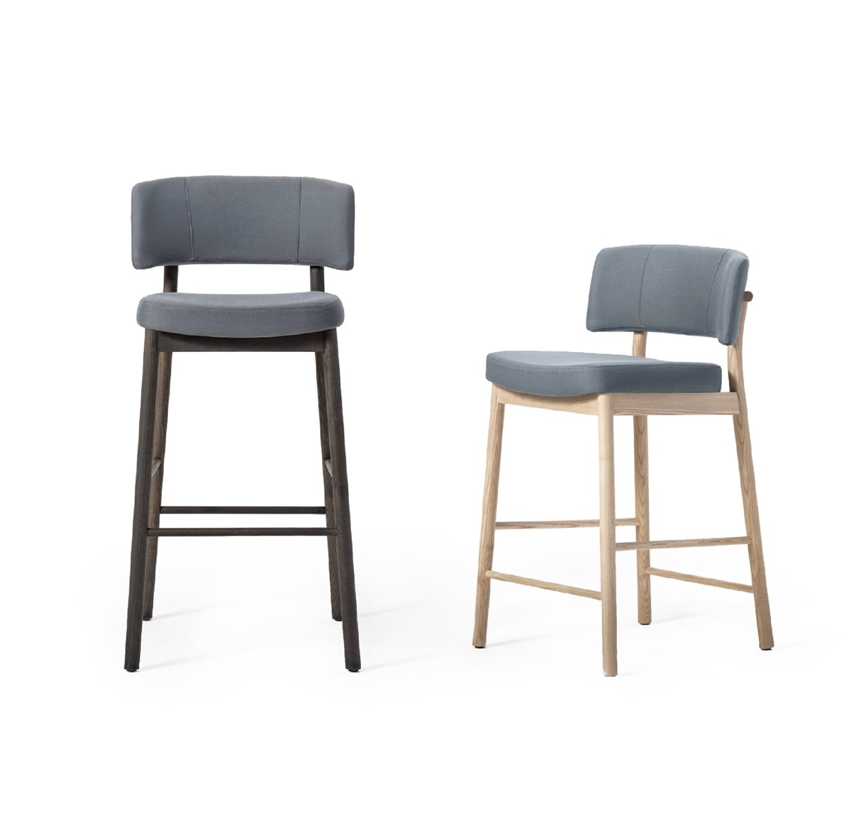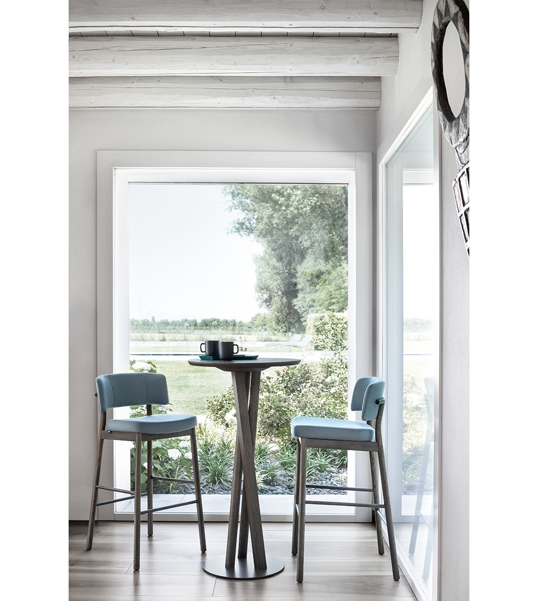 Comfort, an ergonomic shape and a hardy structure are the characteristics of the Marlen design, the new Trabà chair designed by EP Studio. Hints of a Fifties vibe can be glimpsed in the curvature of the backrest – generously padded, like the seat – and in the dynamic, lightweight 4-leg metal rod frame, which becomes bulkier and more retro in the solid ash wooden version.Polished brass or copper add a vintage touch to the colour palette that can be mixed and matched to obtain the perfect chair for residential and tailor-made contract projects alike.