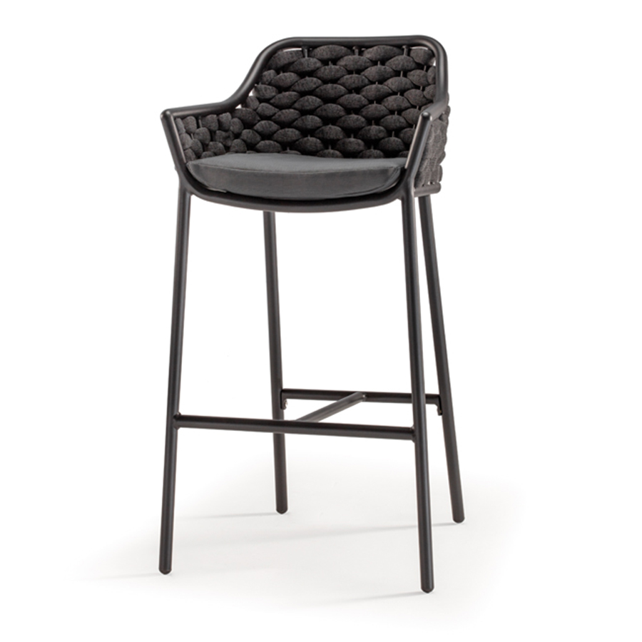 Σκαμπό μπάρας αλουμινίου με επένδυση από textylene και σχοινί από καουτσούκ. Μαξιλάρια από υφαντό (ανθρακί/καφέ ακρυλικό μαξιλάρι)