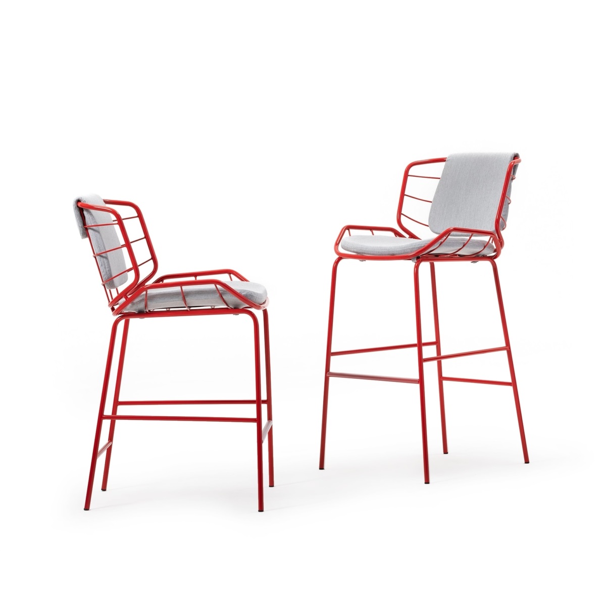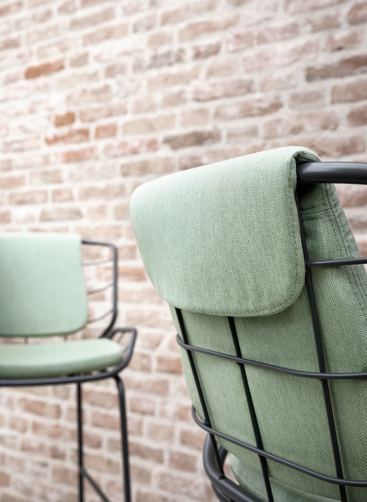 Bringing comfort and style to a snack counter in the kitchen or a public hospitality area, Skin Stool adapts in height and personality to all settings. The painted tubular metal shell can be teamed with full or “light” upholstery options, available in a wide range of fabrics, leathers, eco-leathers and velvets to create tone-on-tone or contrast combinations. As the name suggests, Skin Stool is a second skin for indoor, outdoor and hybrid spaces like verandas, terrace bars and bow windows.