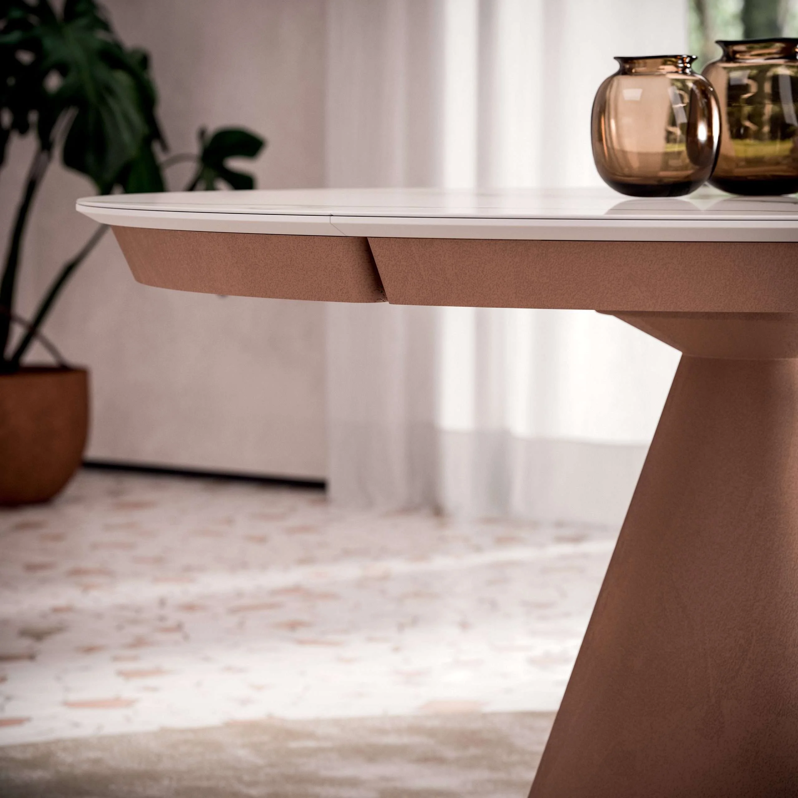 Τραπέζι φαγητού με δυνατότητα επέκτασης. Βάση από βαμμένο μέταλλο ή σκυρόδεμα, επάνω διαθέσιμο σε διαφορετικά φινιρίσματα.