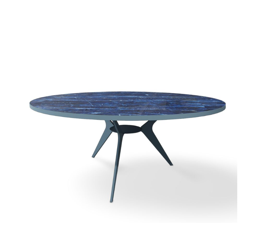 PANAMA is the coffee table that represents the perfect mix of design and functionality thanks to its circular top. Available in three sizes, the metal base can be blue or bronze, as well as the top in stoneware, available with midnight blue or greenish veins.