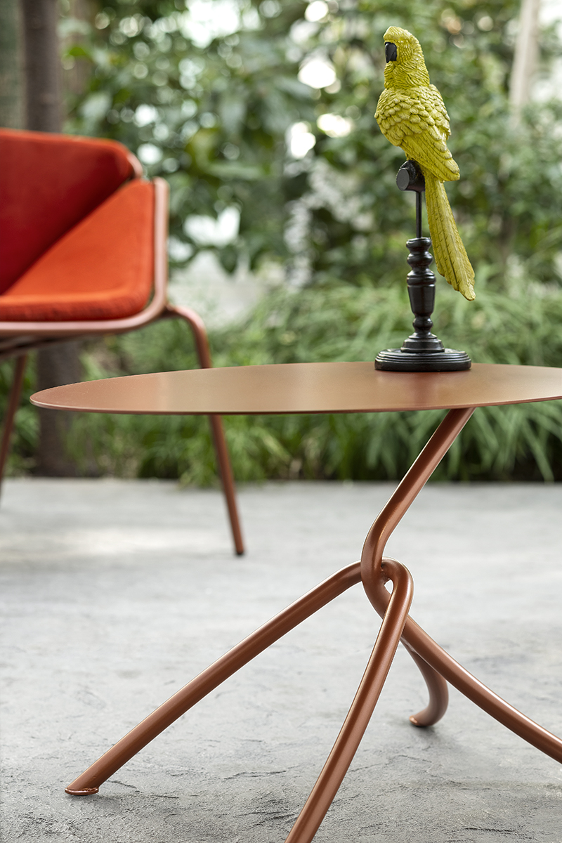 The harmonic, enveloping shells in powder-coated tubular metal that define the Skin armchair – designed by Giacomo Cattani – evolve and transform to compose a true collection.A chair, a stool, two tables, a low one and a high one, and the ever increasing range of colours available breathe life into a collection of furniture that fosters chatting and relaxation; welcoming, geometric patterns designed to meet the requirements of contemporary projects geared more and more towards a mix of indoor and outdoor.The play on colours – a plus point that defines the Trabà production – can be stressed by the countless options open when it comes to the shades and fabrics of the body: a wide selection for indoor and outdoor environments, eco-leather for creating fun tone-on-tone seats or bolder contrasting colour effects.Skin, perfect for adding a touch of personality to sophisticated residential and contract projects: like a second skin for gardens, patios, terrace-bars, verandas and bow-windows.