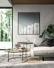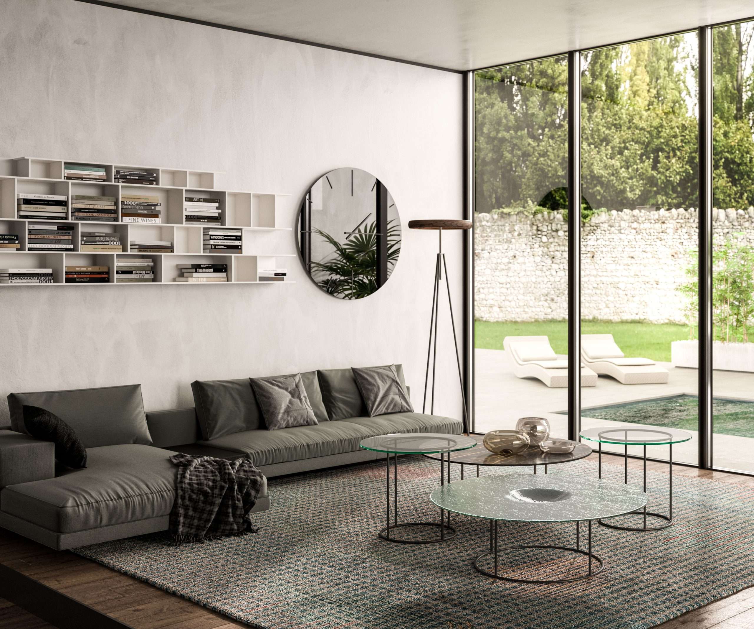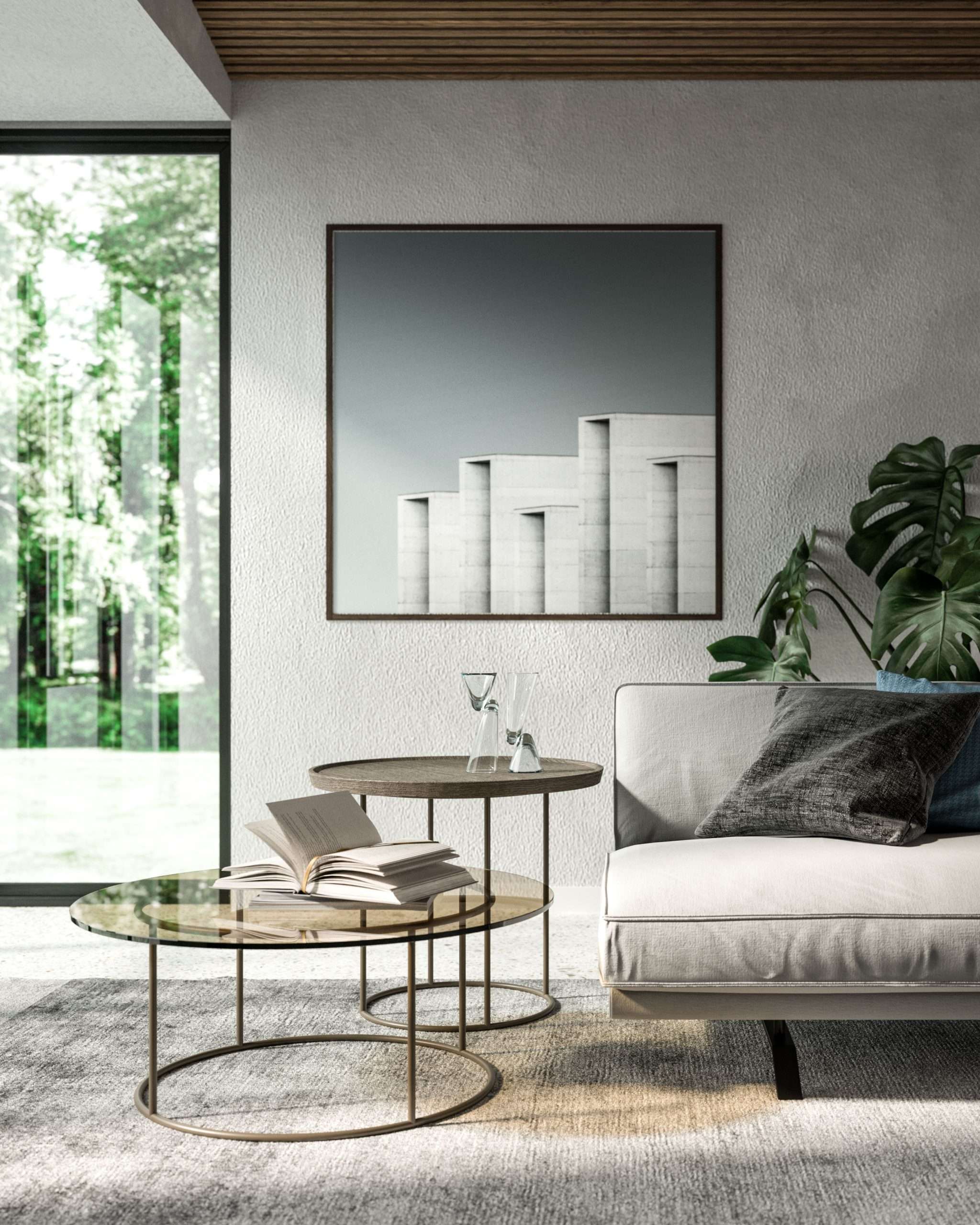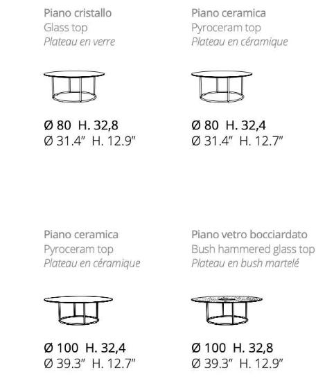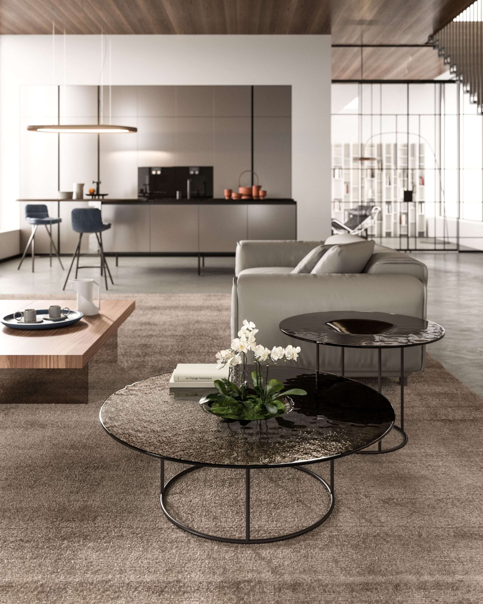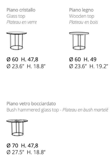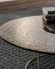 Τραπεζάκι σαλονιού με μεταλλική βάση σε δύο ύψη, τοπ σε διάφορα φινιρίσματα. Επιφάνεια από σφυρήλατο κρύσταλλο στο κέντρο της οποίας διαμορφώνεται μια εσοχή για διάφορα αντικείμενα.