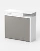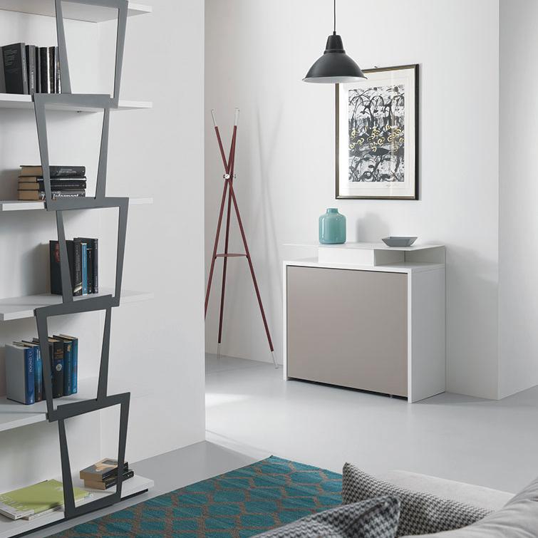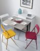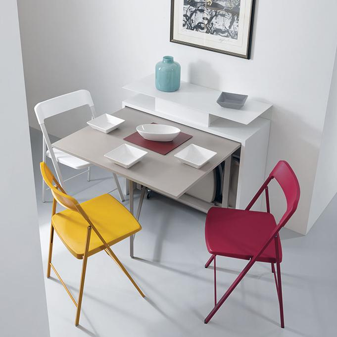 Επεκτάσιμο τραπέζι κονσόλας με αμμοβολή, βαμμένο ατσάλι και φιλικό προς το περιβάλλον πάνω μέρος laminate με διαδικασία αναδίπλωσης. Το τραπέζι συνοδεύεται από 2 προεκτάσεις των 42 cm η καθεμία που βρίσκονται σε ένα δοχείο μέσα στην κατασκευή. Θέσεις: έως 6 άτομα