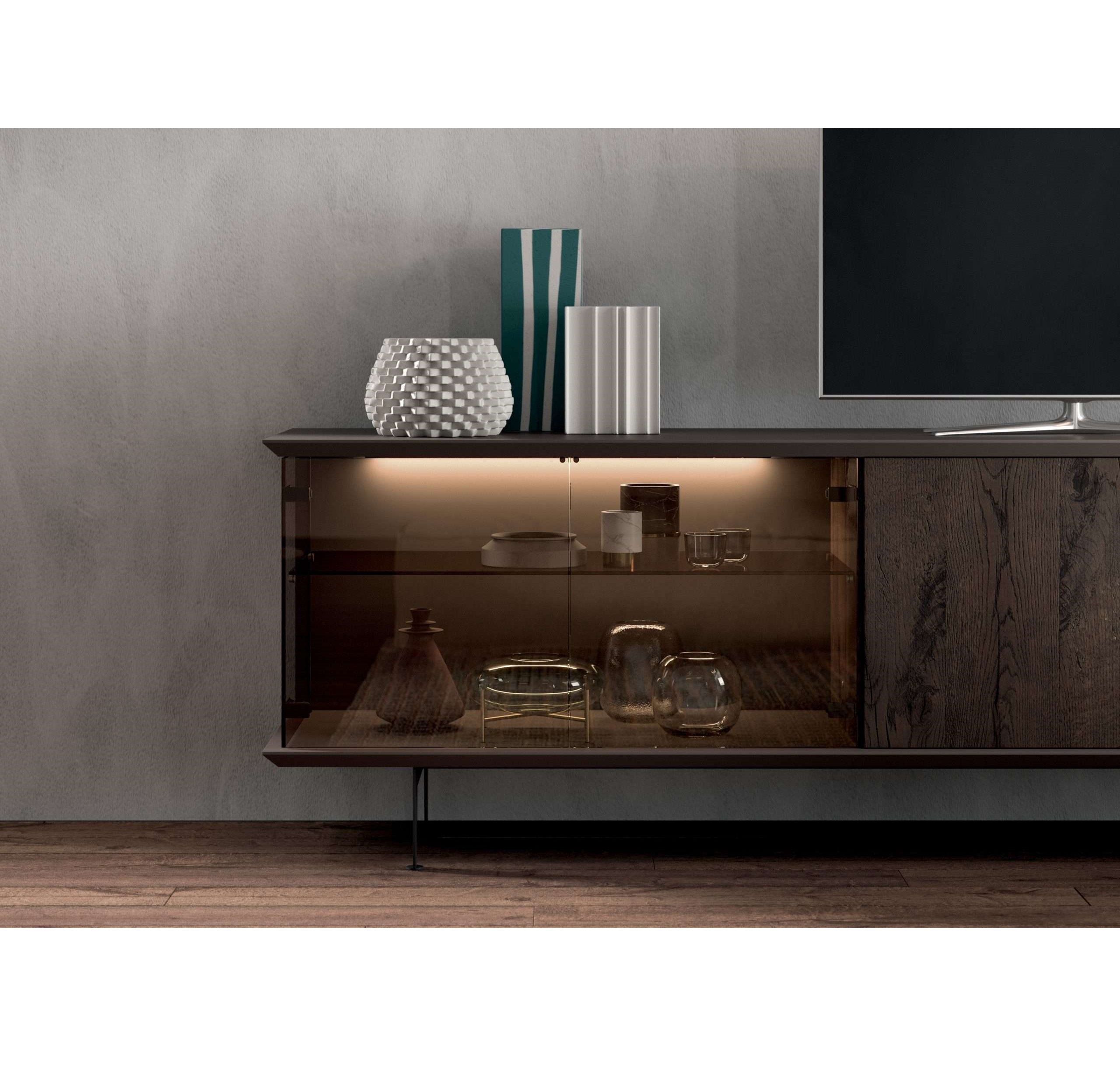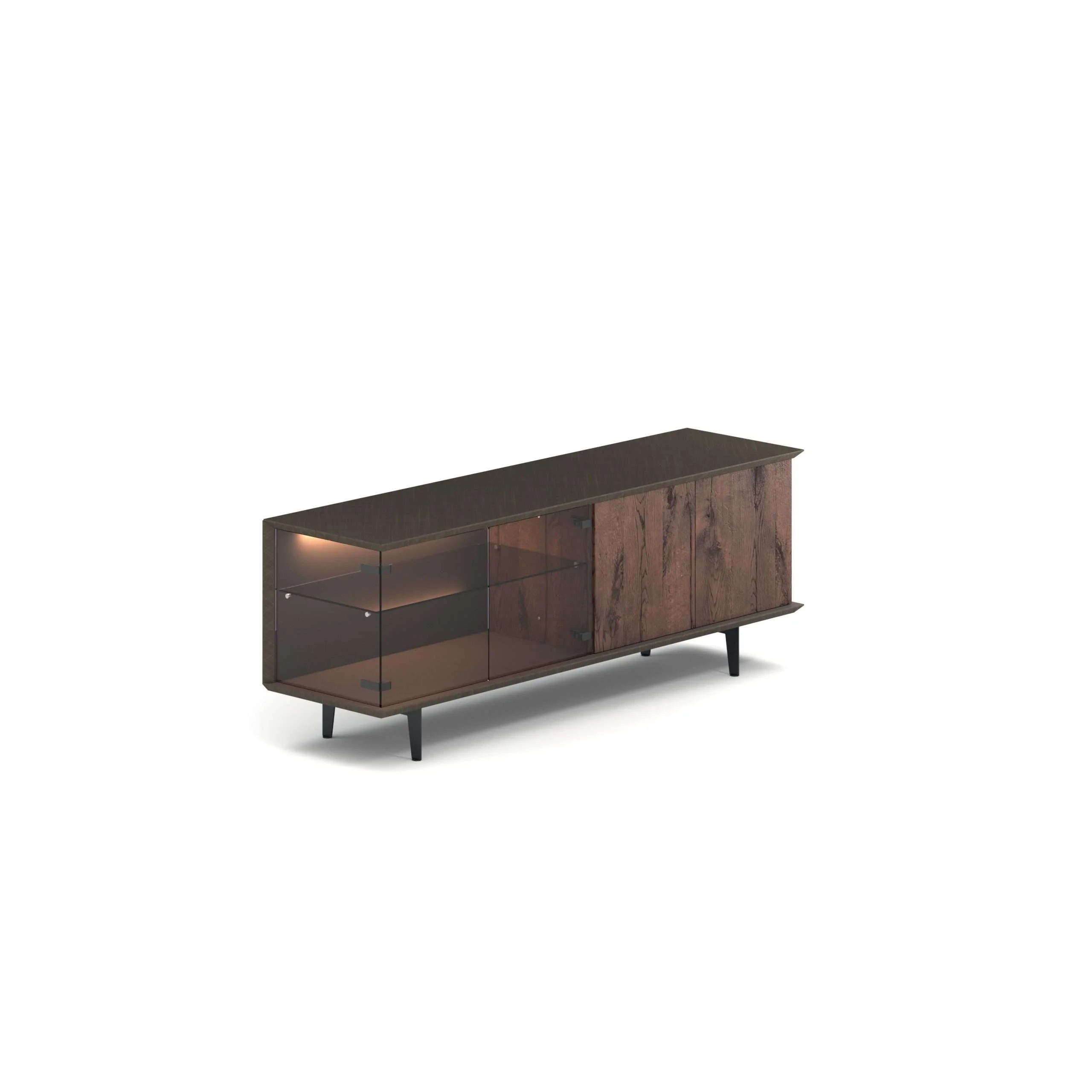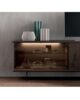 Sideboard with container, left side in glass and right in natural or lacquered wood. LED light applied inside the glass portion. Painted metal feet.