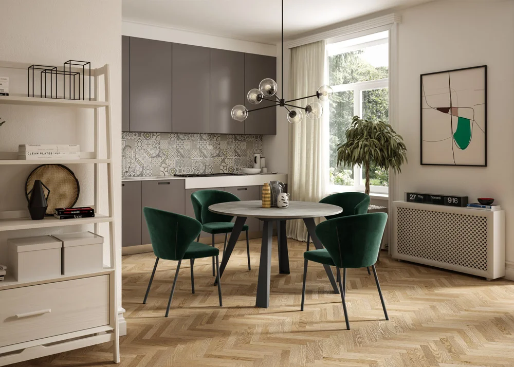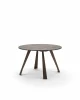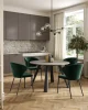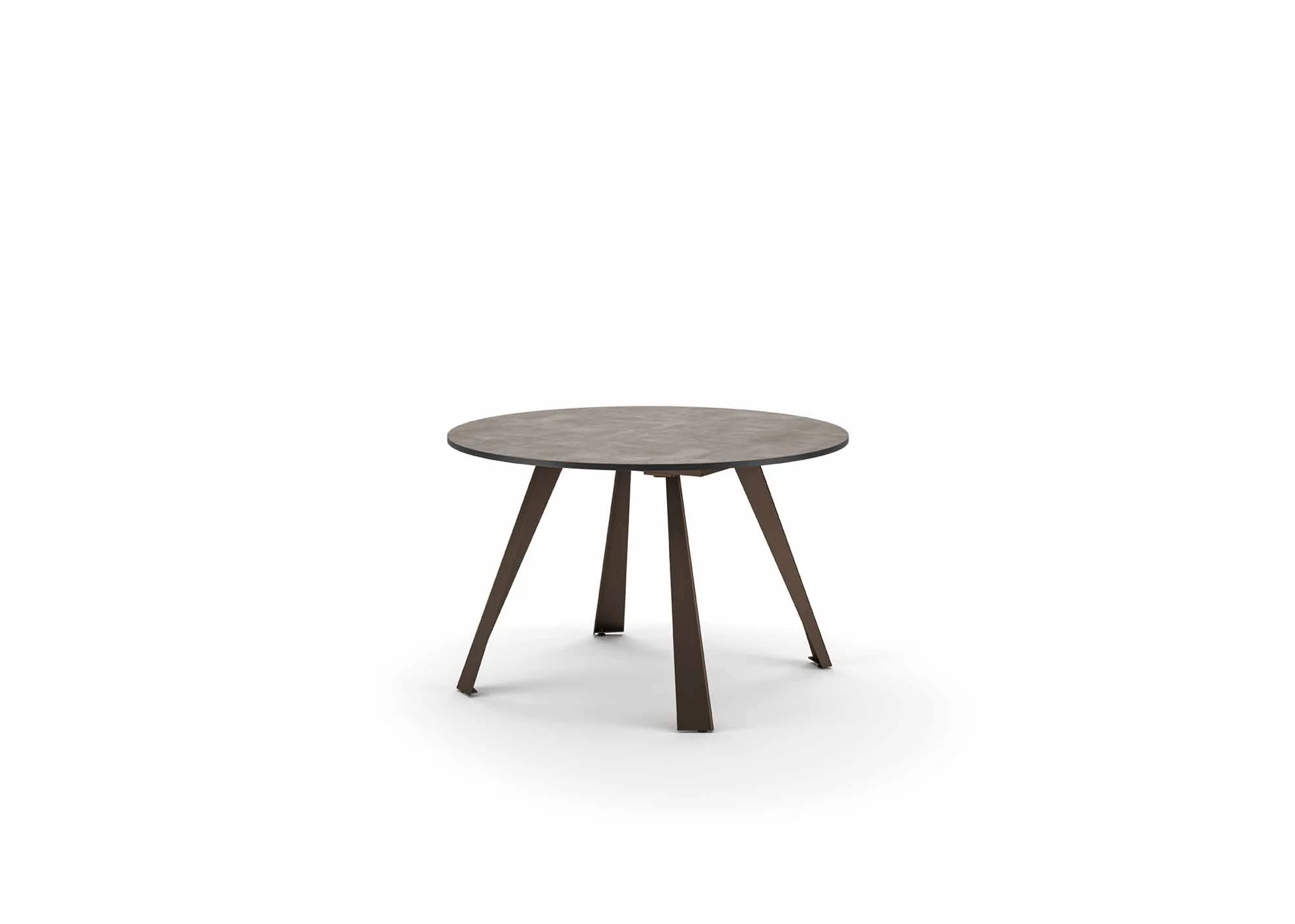 Extendable dining table with metal base. Eco-wood top and 3 extensions. Legs stay on the outside when the mechanism is open. Aluminium elescopic extension system. Extensions bag is included.