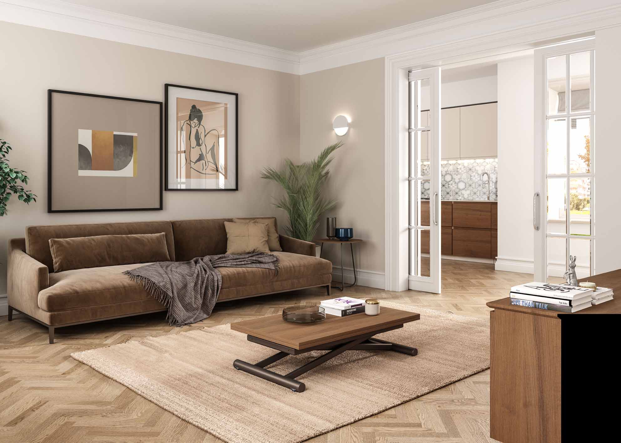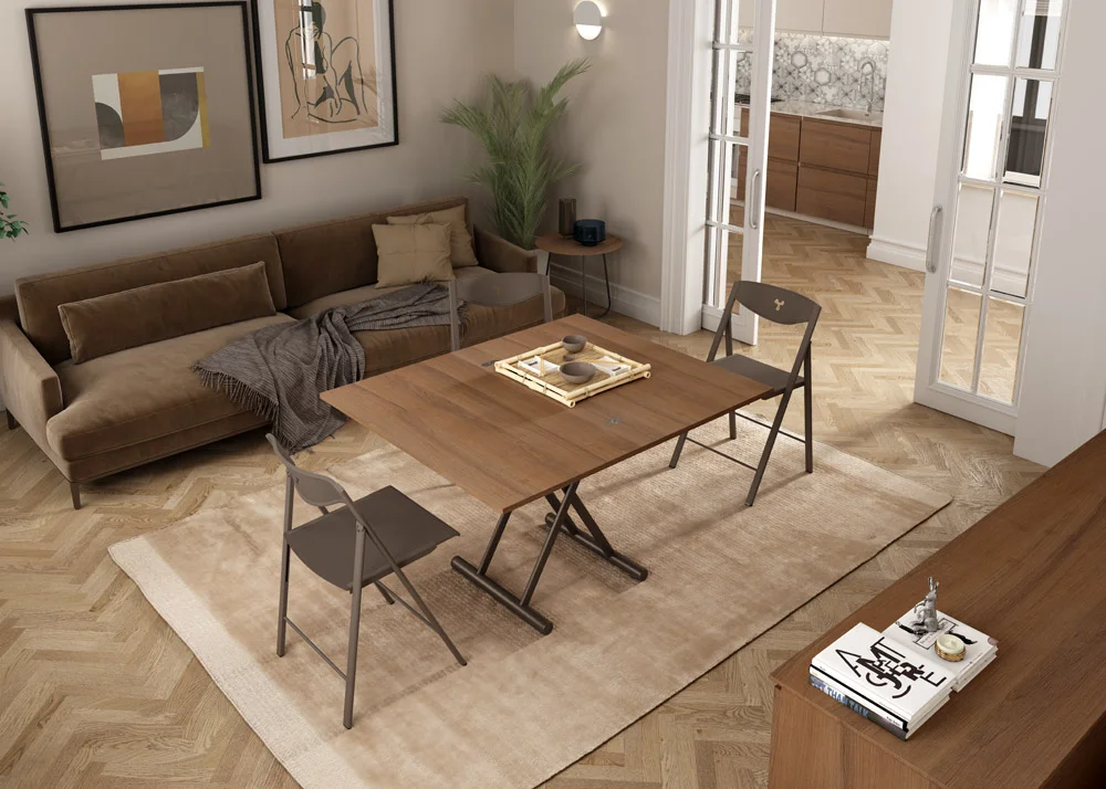 Transformable table folding top (38mm) system. Metal base and fine tuning gas piston lifting system adjustable at any hight. 4 wheels for easy movement.
