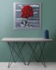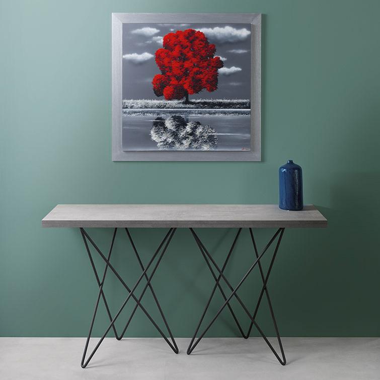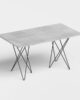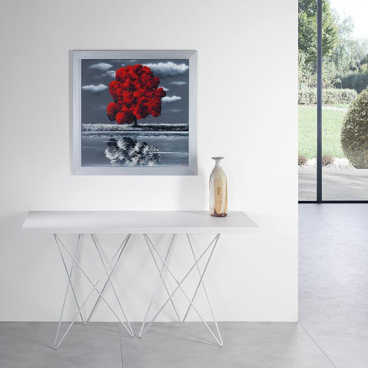 Μετατρέψιμο τραπέζι κονσόλας με άνοιγμα σαν βιβλίο στο επάνω μέρος σε φιλικό προς το περιβάλλον laminate πάχους 18 mm. Η δομή αποτελείται από 2 περιστρεφόμενα πόδια από συμπαγή στρογγυλό χάλυβα Ø 12 mm βαμμένα με αμμοβολή. Θέσεις: έως 6 άτομα.
