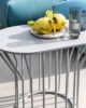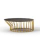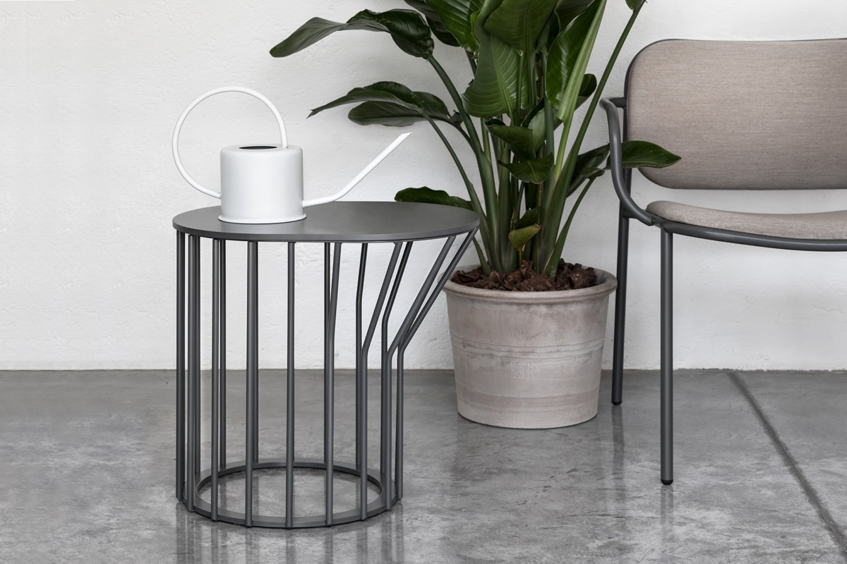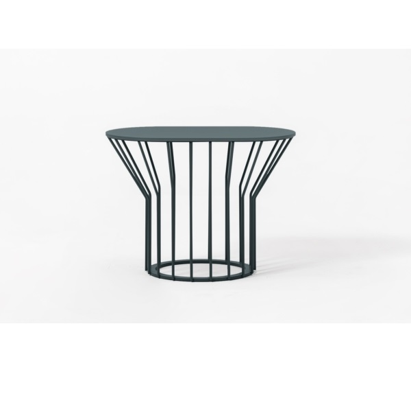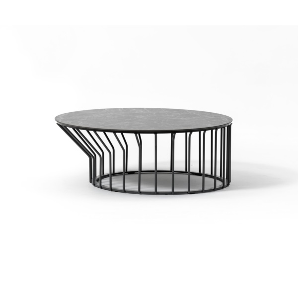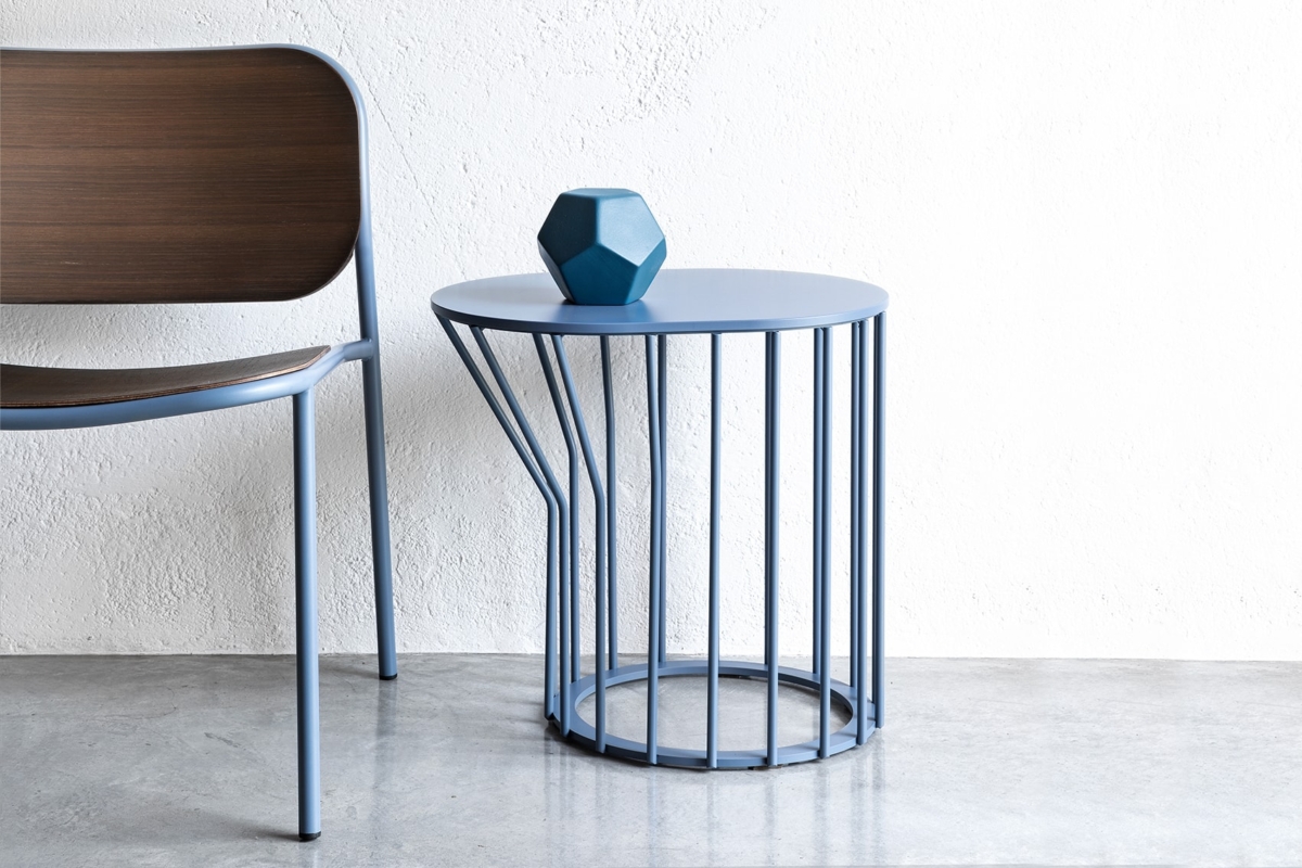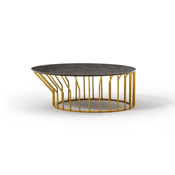 Μια συλλογή από τραπεζάκια σαλονιού με αυθεντική έγχρωμη μεταλλική βάση: ακτίνες σε ίση απόσταση είτε εκτείνονται ευθεία προς τα πάνω από την κυκλική βάση είτε λυγίζουν και ανοίγουν προς τα έξω, δημιουργώντας ένα ξεχωριστό σχέδιο και κίνηση.