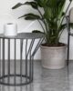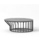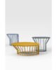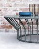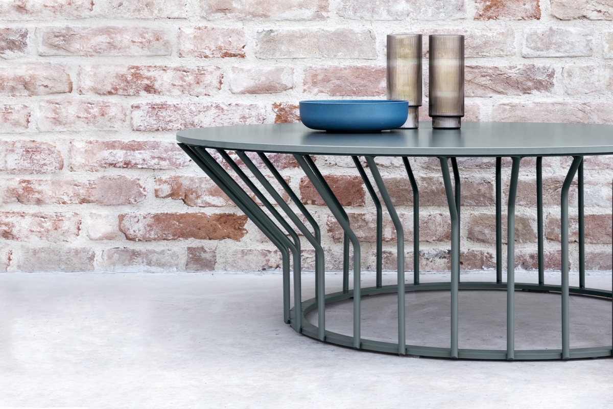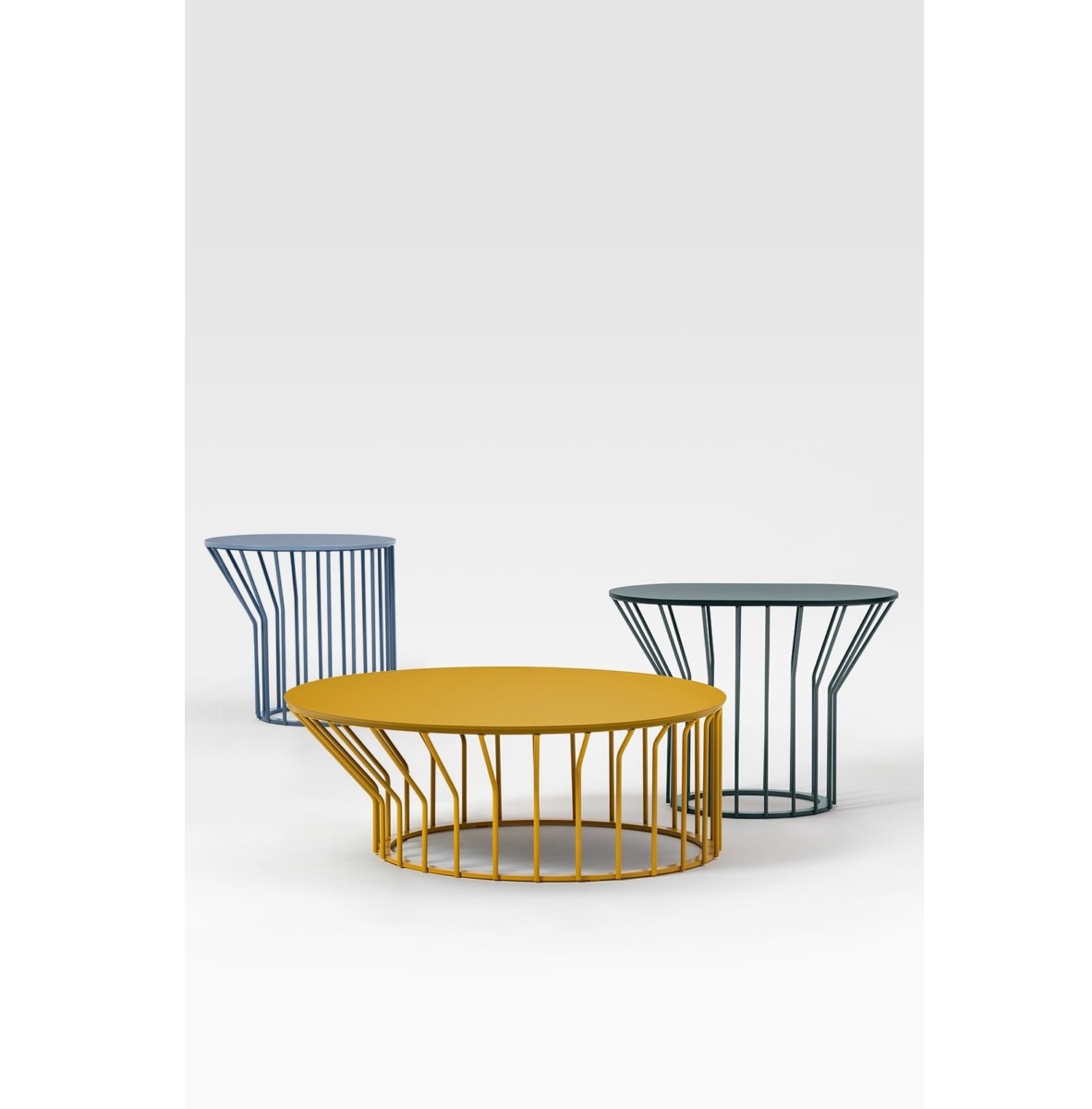 A collection of coffee tables with an original coloured metal base: equidistant spokes either extend straight up from the circular base or bend and open outwards, creating a distinctive design and movement.