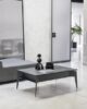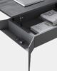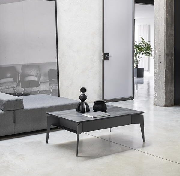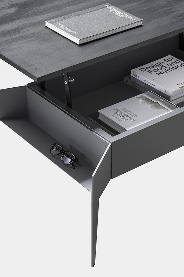 Liverpool is a transformable coffee table. The liftable top that hides a practical container transforms the low table into a practical work or leisure surface. The lifting system with compass movement is assisted by gas pistons that, in addition to facilitating the movement of the top, slow down and cushion its weight during closing. The movement is practical, solid and functional: the top lifts 25 cm and moves 35 cm closer, making it easy to use when you are comfortably seated on the sofa. The load-bearing structure in 6 mm thick steel sheet is painted with a sandblasted structure, the container element and the top are made of 18/25 mm thick eco-friendly laminate. The central part of the compartment is hidden by the top when it is lowered, while the lateral parts are open and usable for storing frequently used objects.