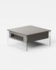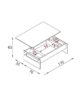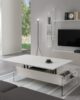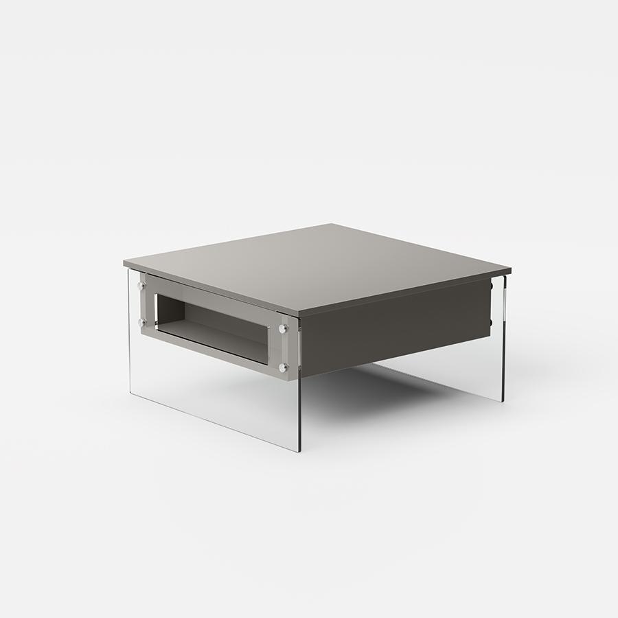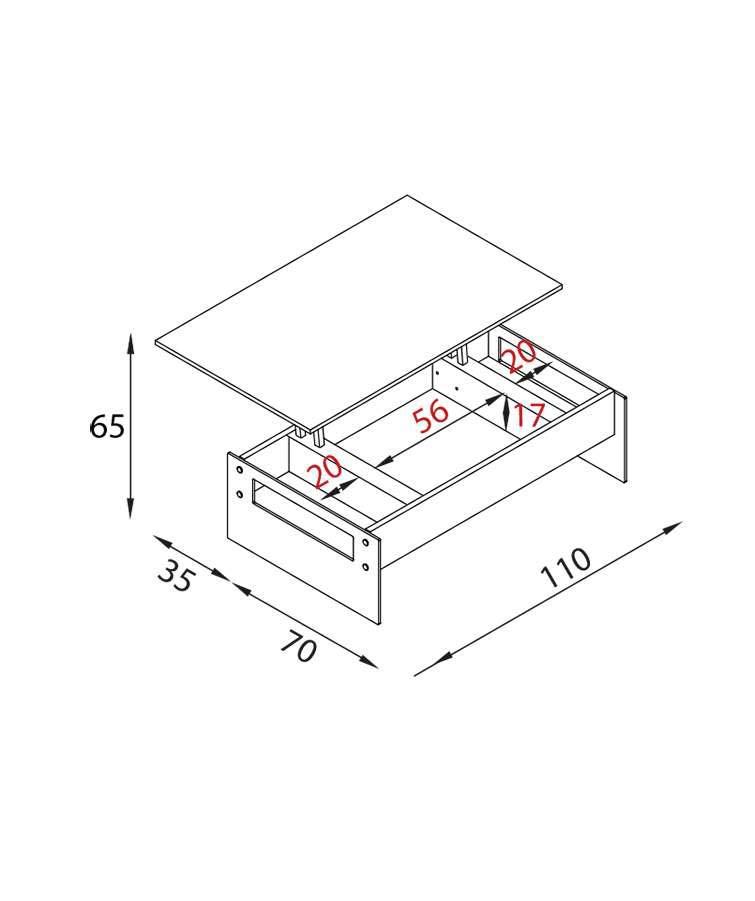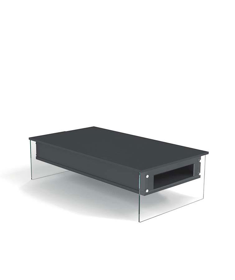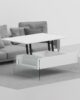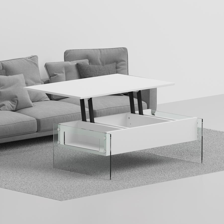 Multifunctional table with a liftable top that hides a practical container. Made of 18 and 25 mm Ecological Laminate. Sides in 10 mm thick tempered glass. The movement raises the top by 25 cm and moves it forward by 35 cm.