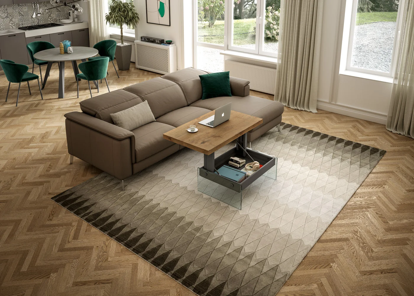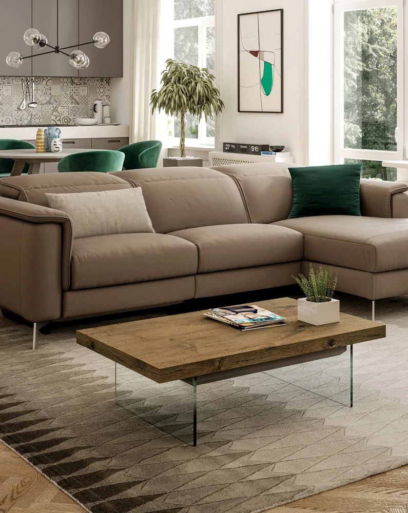 Τραπέζι πολλαπλών λειτουργιών διπλού ύψους με σύστημα ανύψωσης αερίου αυτόματου φρεναρίσματος (32 έως 65 cm). Το πάνω μέρος είναι κατασκευασμένο από οικολογικό ξύλο με πτυχές στις άκρες. Μεταλλική δομή και δοχείο, καθαρά κρυστάλλινα πόδια.