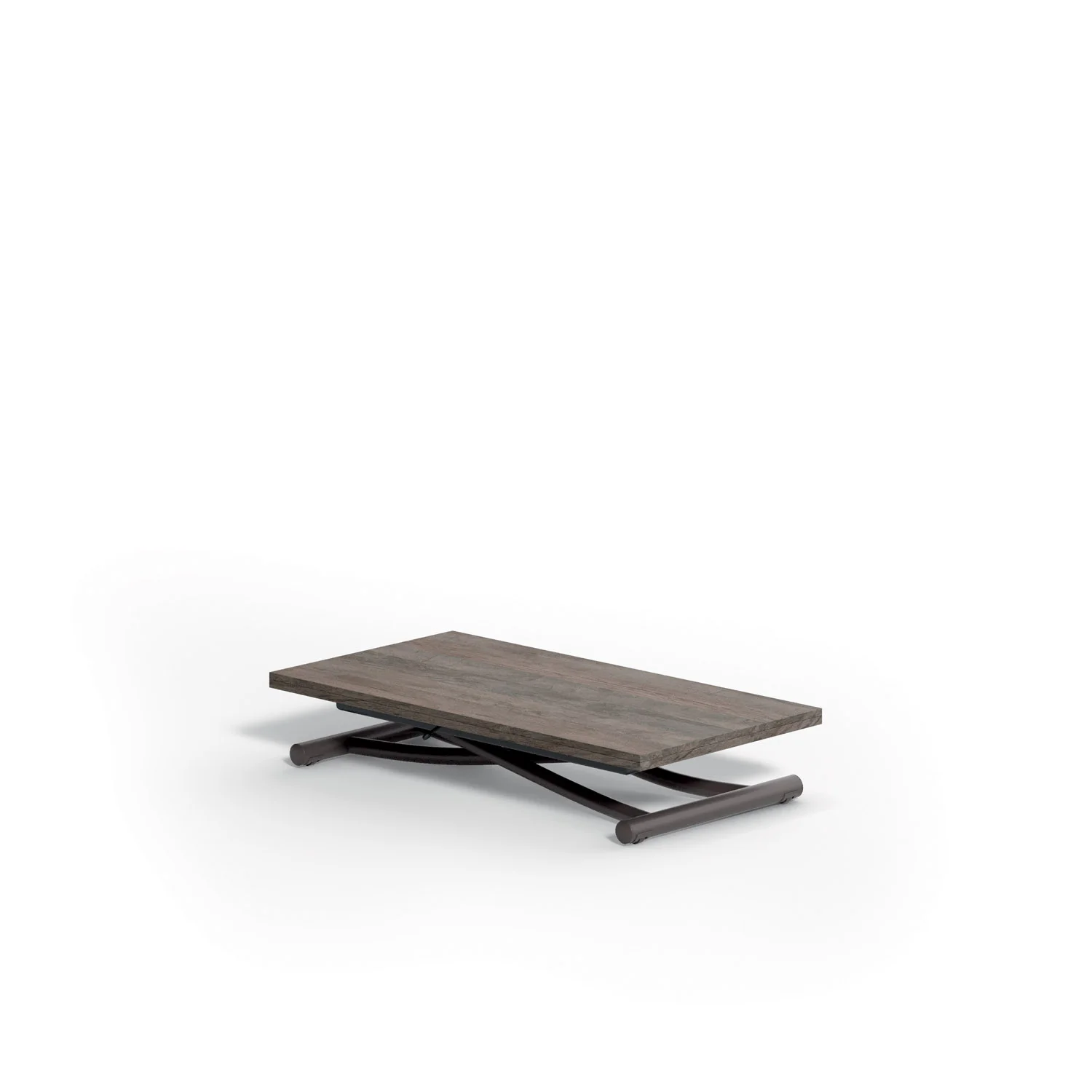 Metal frame transformable table, gas adjustable height from cm 23 to cm 80, synchronised telescopic extension mechanism.